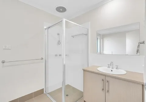 - Neat and tidy main bathroom with corner shower, toilet and vanity with additional storage below
