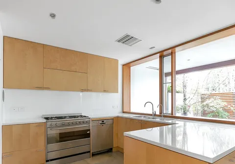 - Modern kitchen located downstairs with Ceaser Stone bench tops, a 6 burner gourmet gas cooker, dishwasher and ample cupboard storage