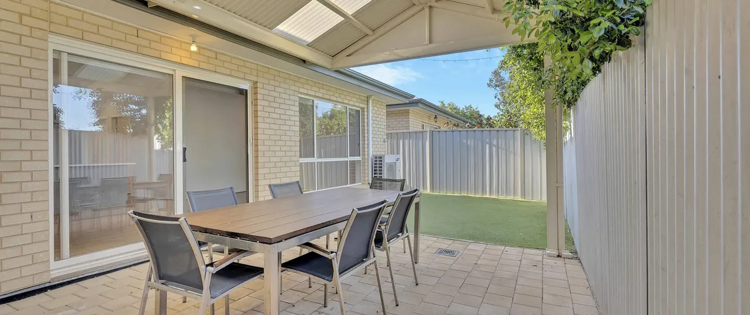 - Fully fenced rear yard with paved pergola area and artificial turf