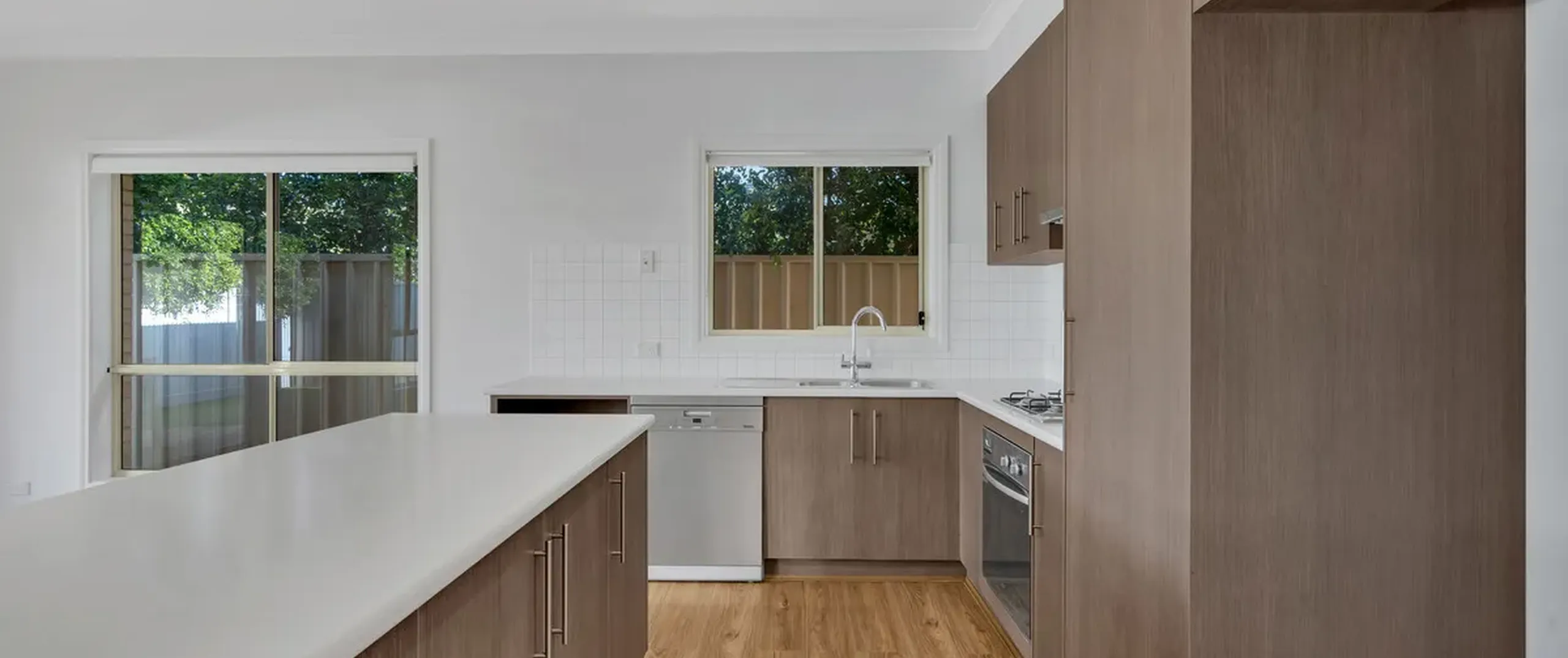 - Modern kitchen with stainless steel dishwasher and oven, gas cooktop and ample cupboard space