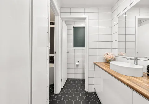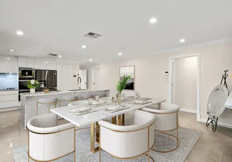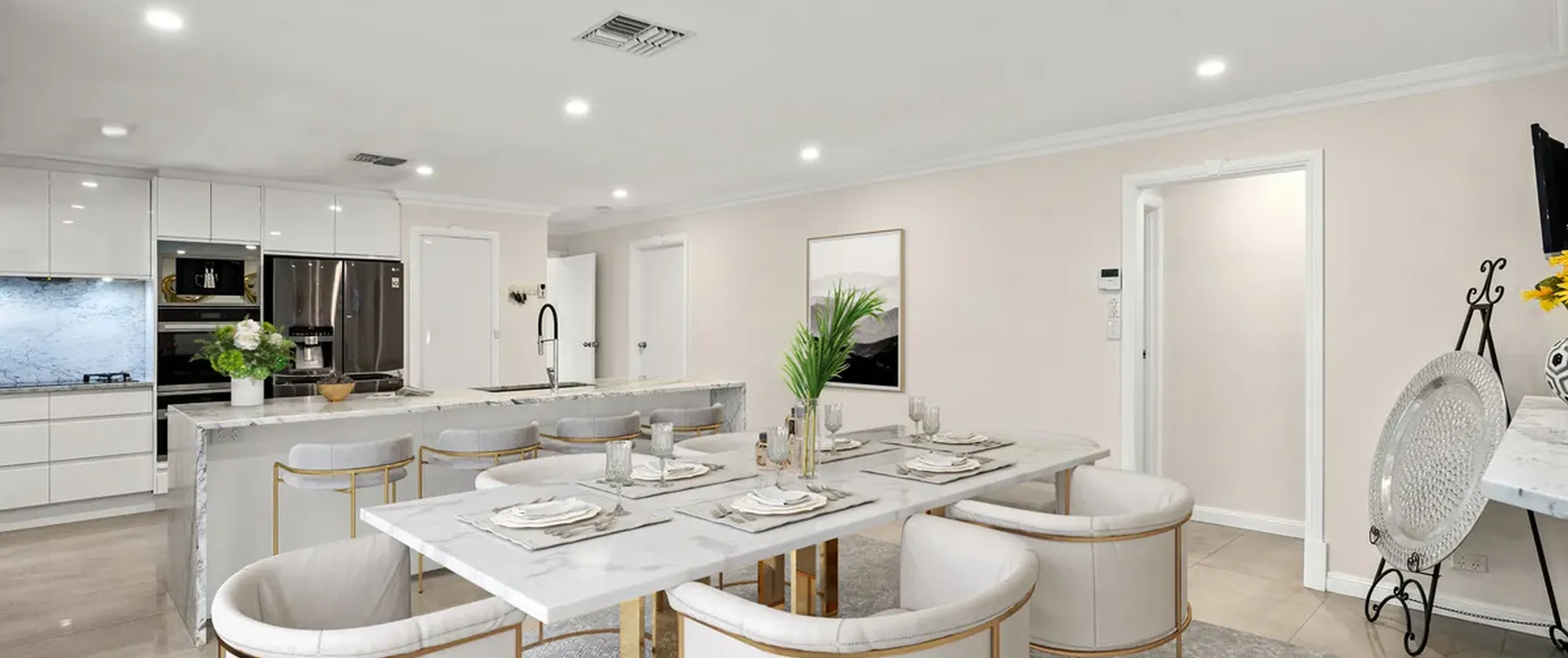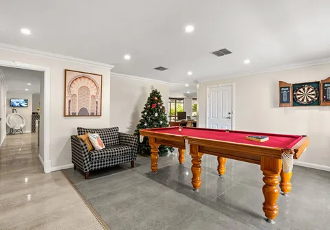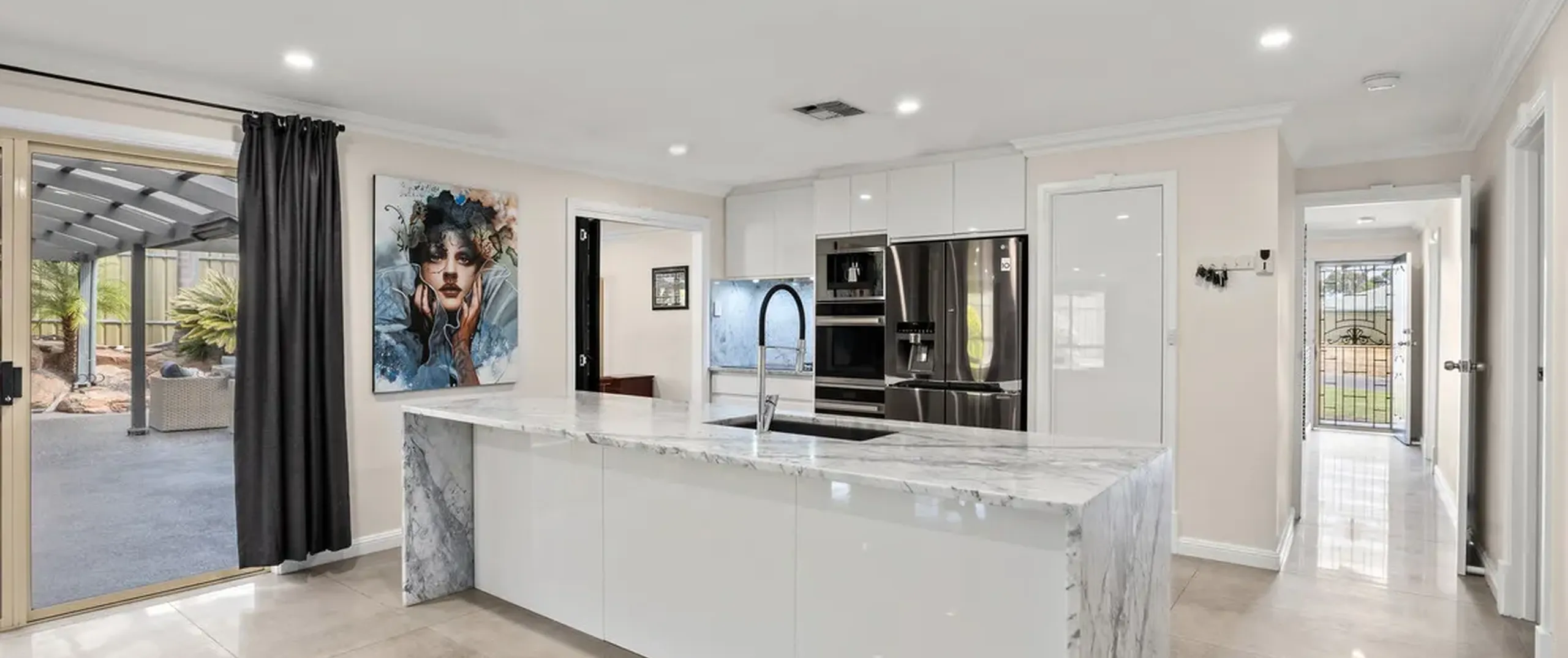 - Sleek kitchen with marble bench tops and breakfast bar, dishwasher, gas and electric cooktop, oven, steamer, coffee machine and walk-in pantry