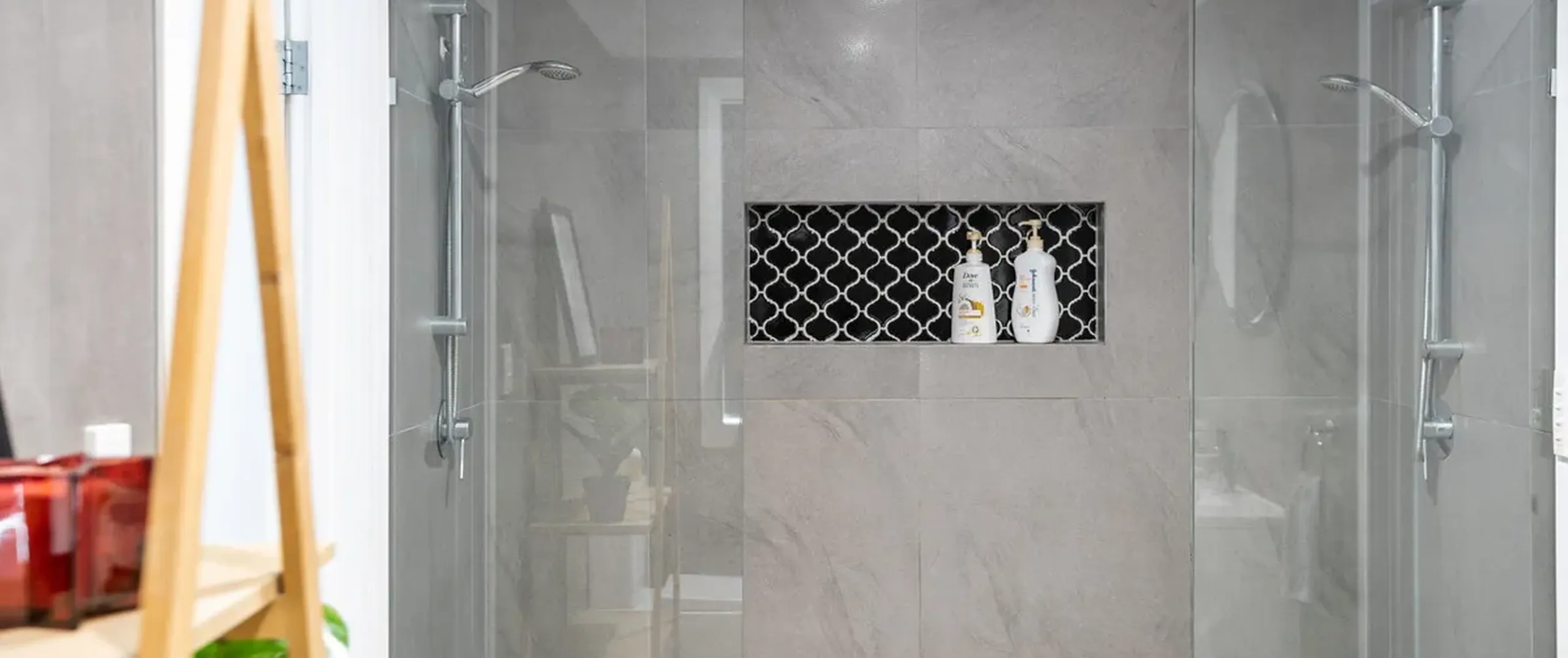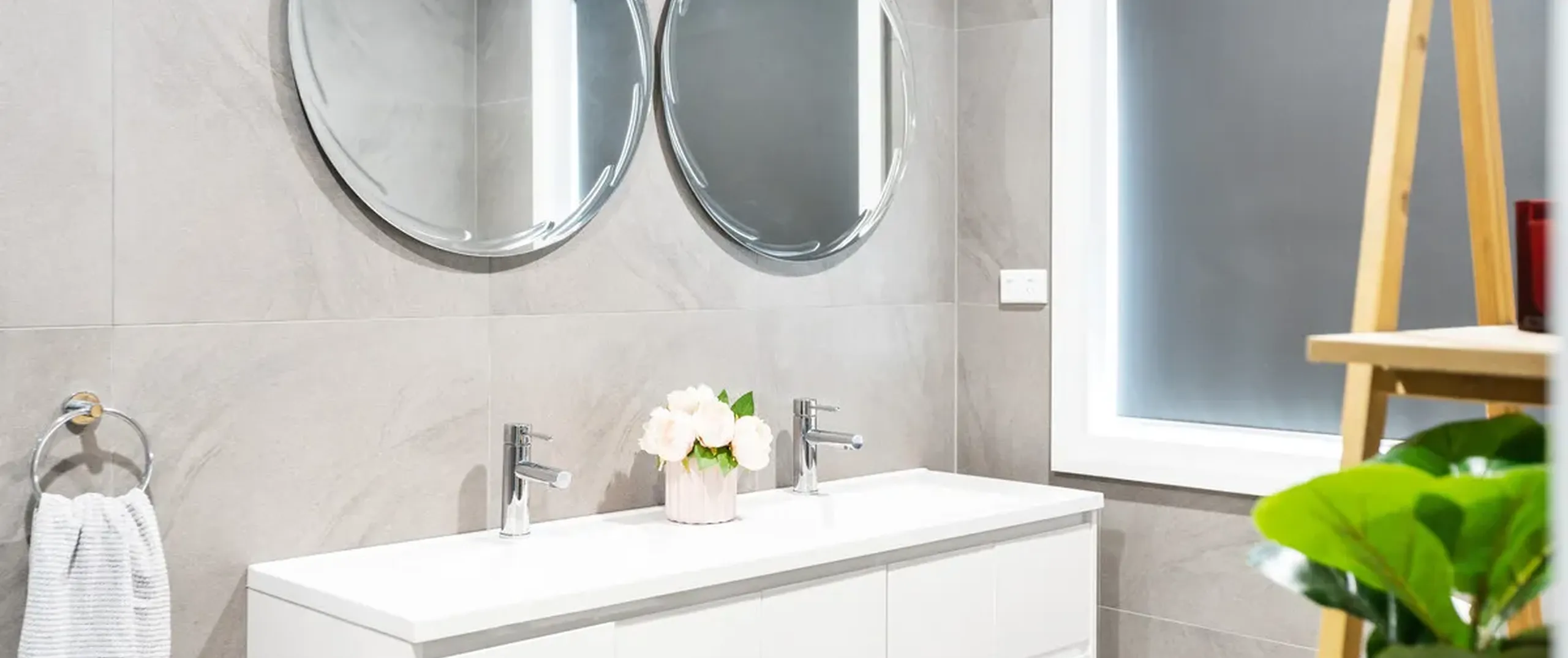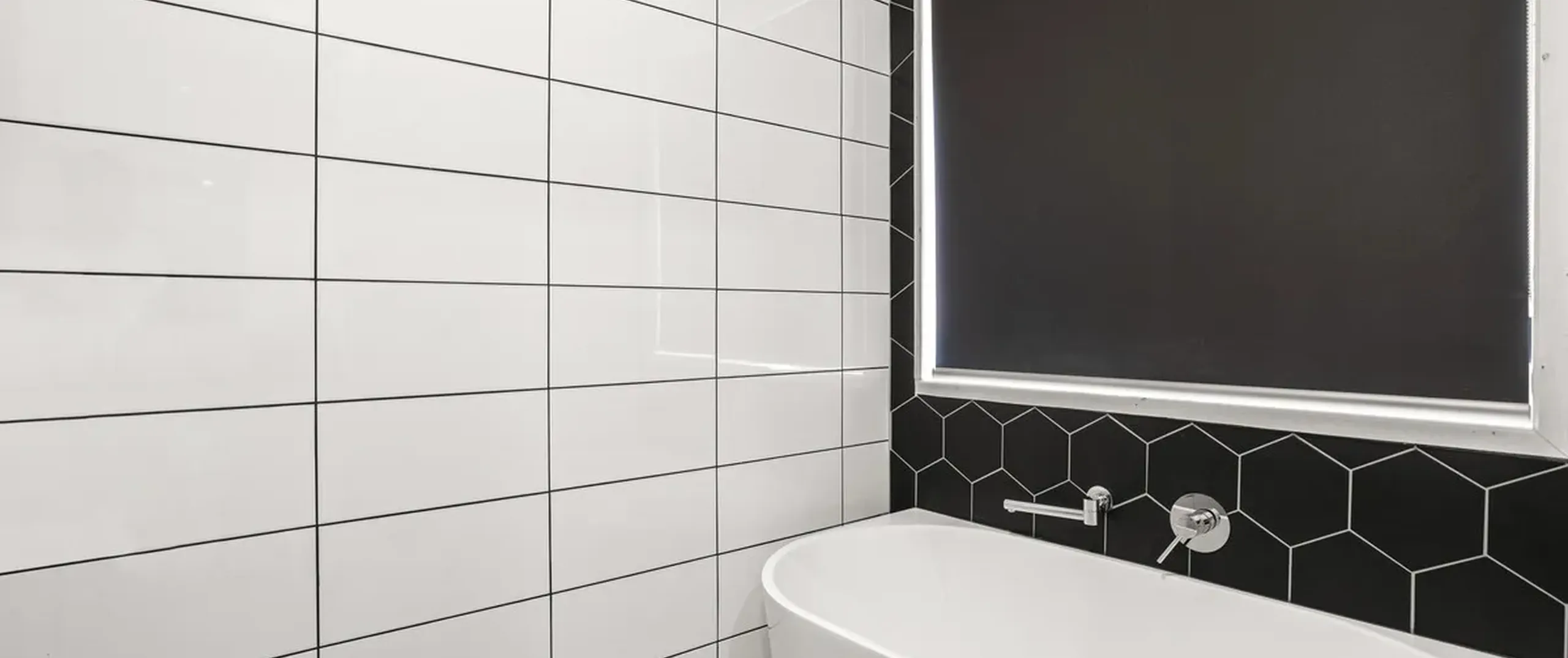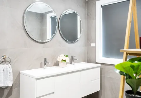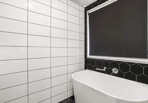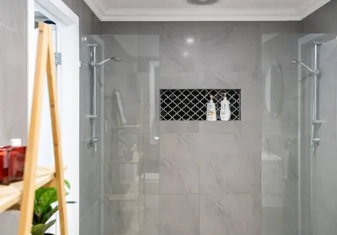 - Bathroom featuring floor-to-ceiling tiles, free-standing bath plus double vanity and shower