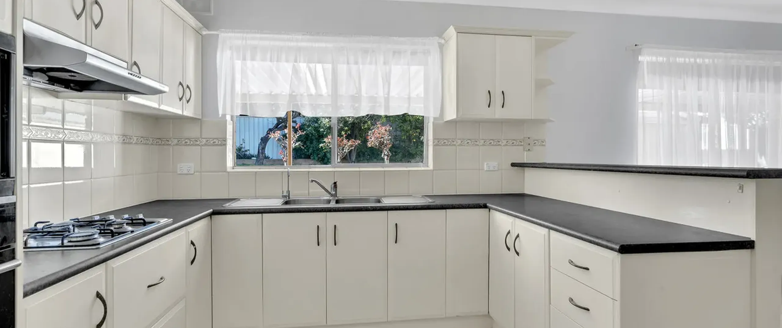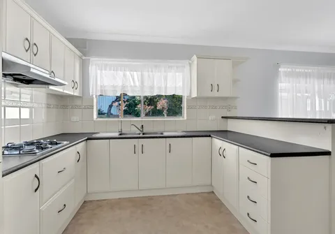 - Spacious kitchen with double sink, gas cooktop and ample storage and bench space