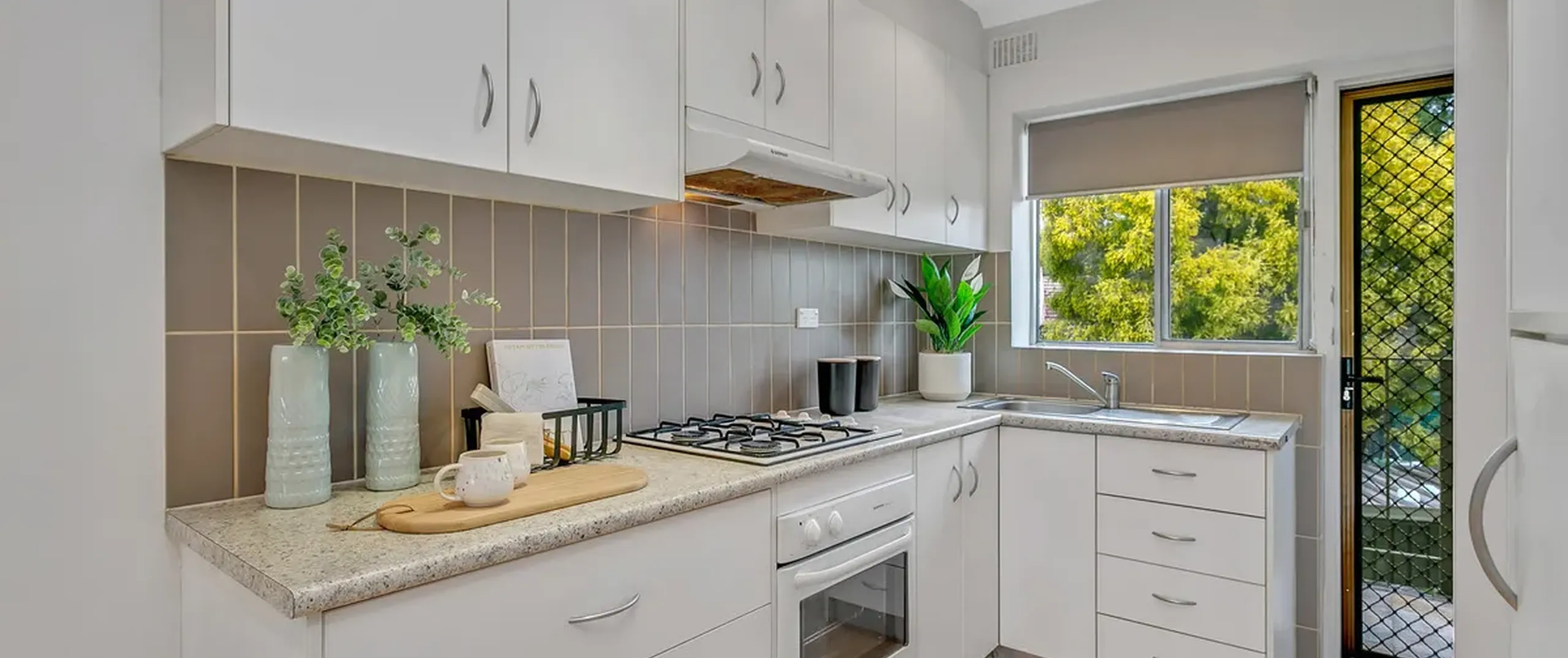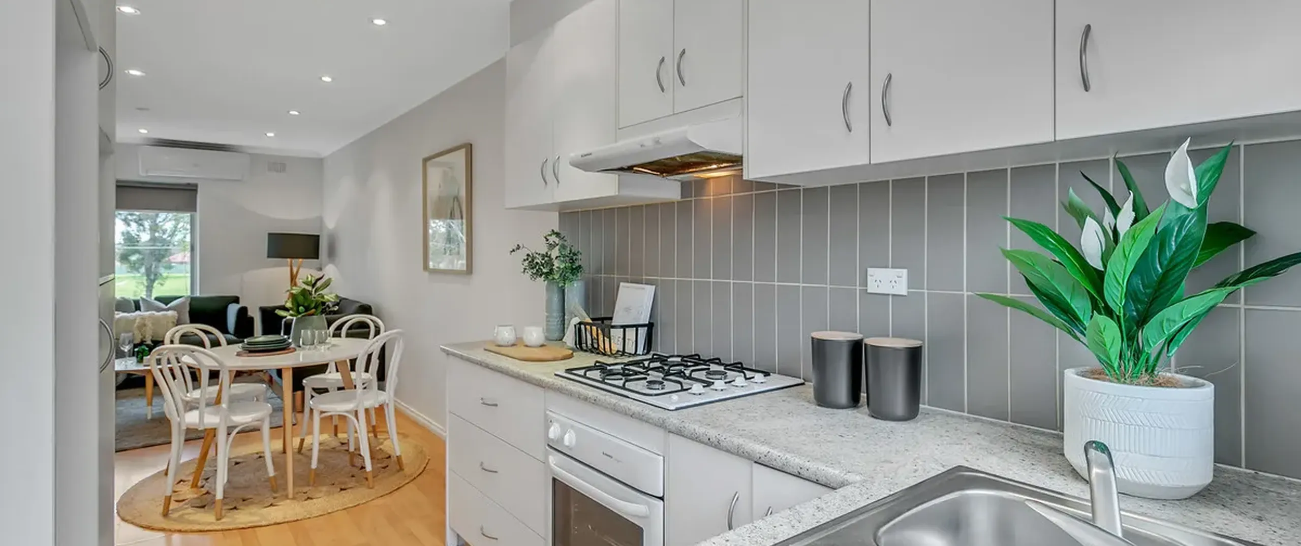 - Stylish kitchen with gas cooktop and ample cupboard and bench space