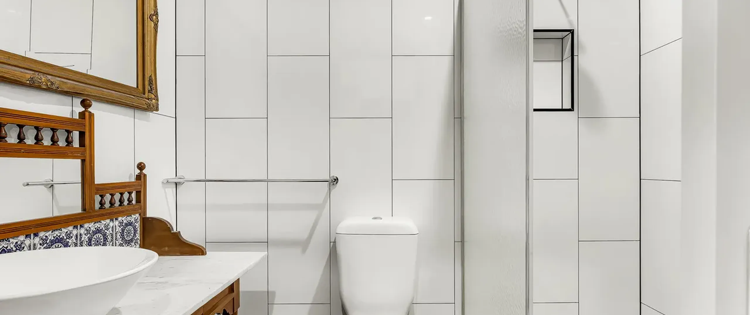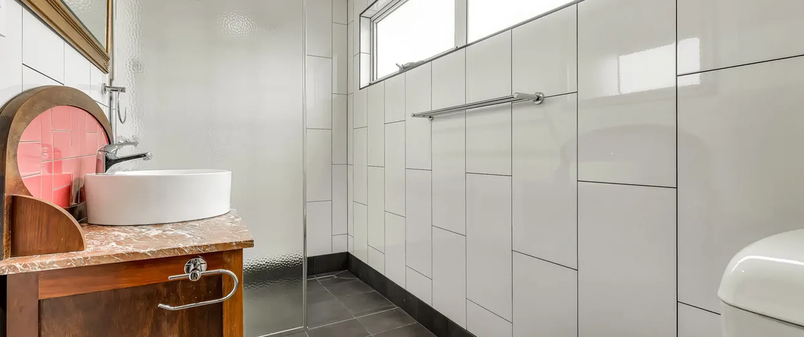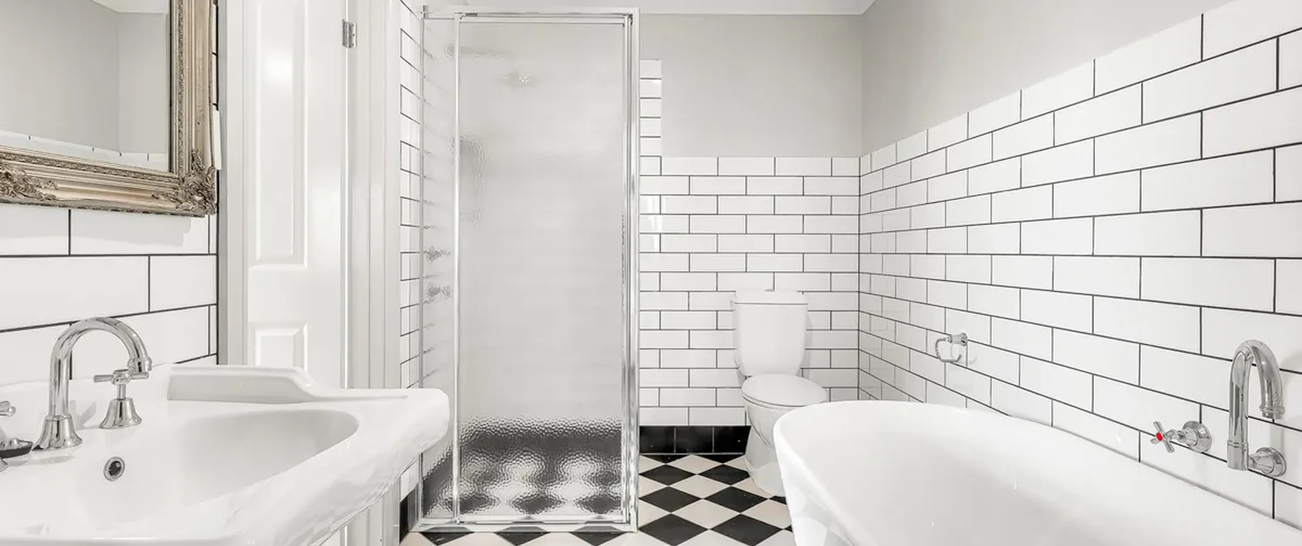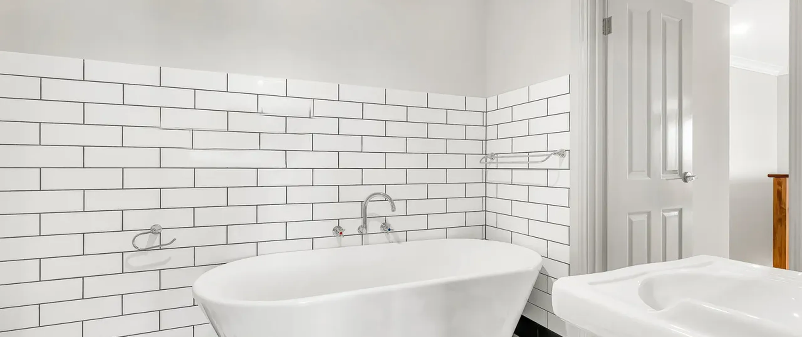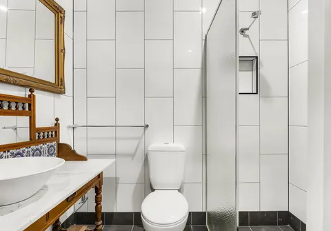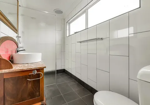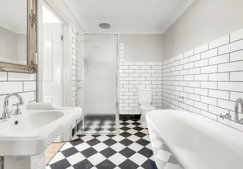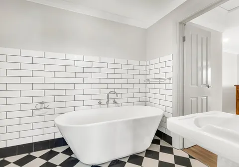 - Main bathroom with feature tiling and separate bathtub