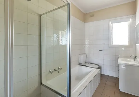 - Sparkling white bathroom with a separate bath and shower