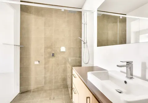 - Well-appointed main bathroom featuring a large shower and ample cabinet space beneath the vanity.