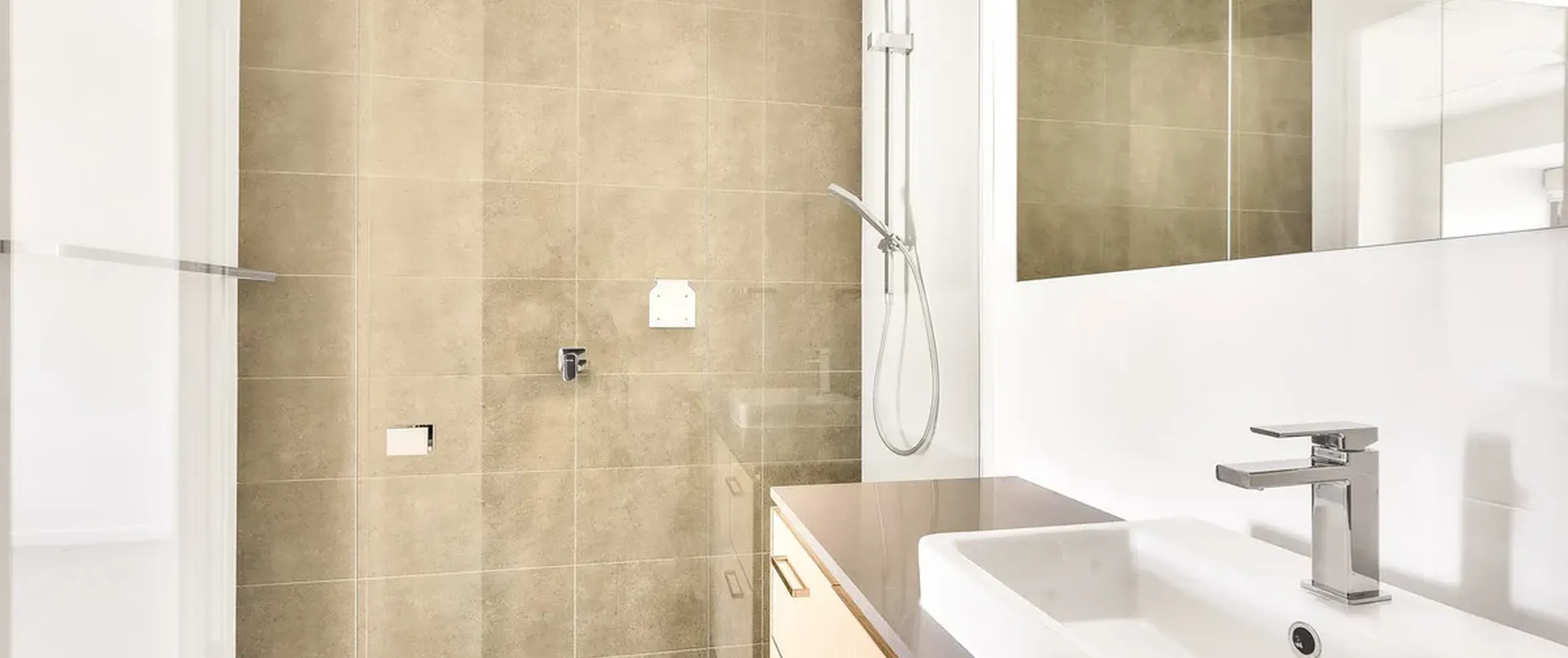 - Modern ensuite with floor to ceiling tiles, large corner shower, toilet and vanity with extra storage space below