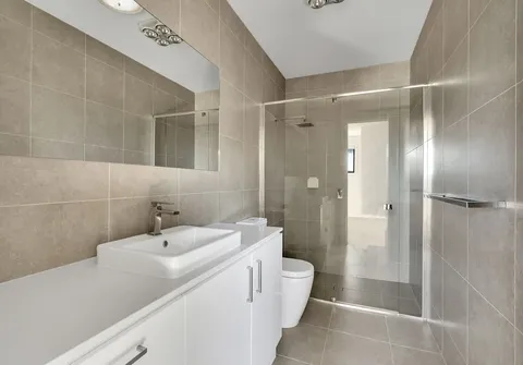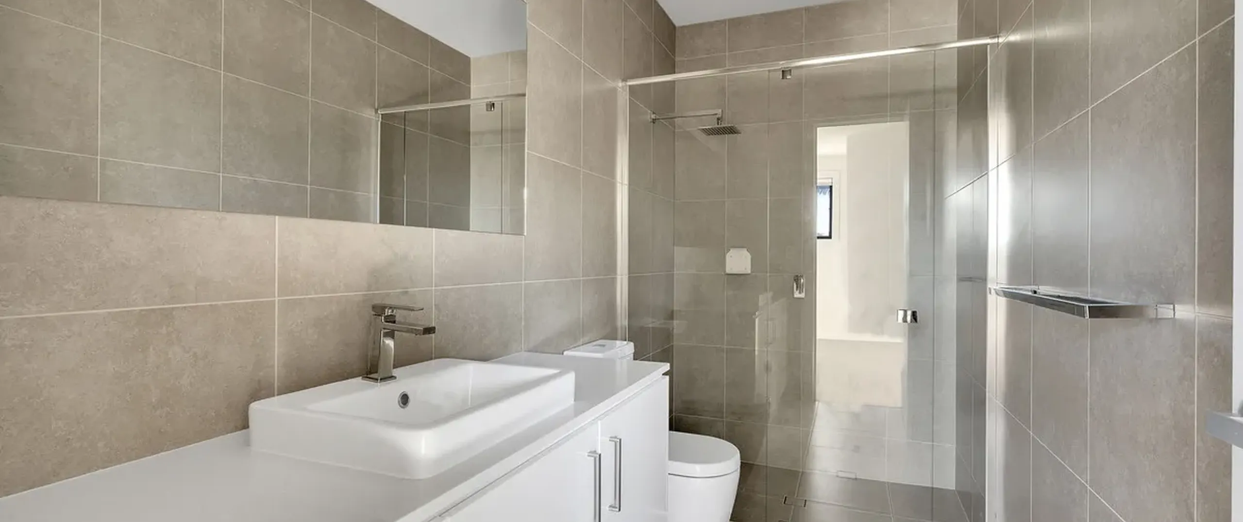 - Modern ensuite with floor to ceiling tiles, large corner shower, toilet and vanity with extra storage space below