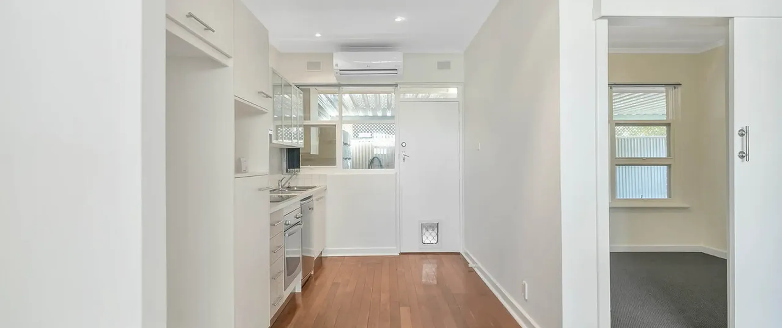 - Kitchen complete with electric cooktop, oven, dishwasher, double sink, split system air conditioning and door leading to the rear yard