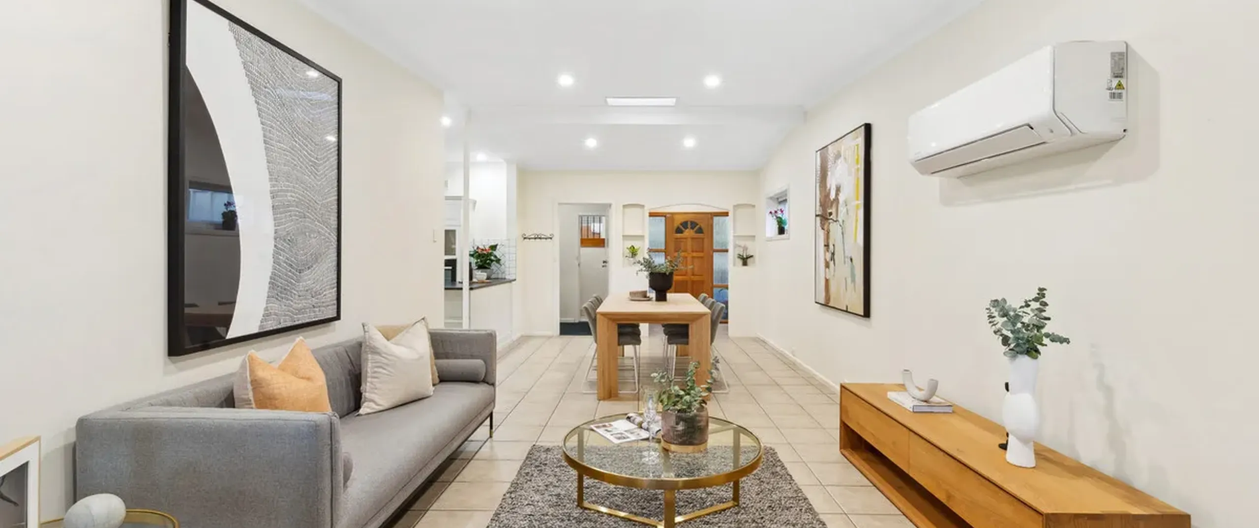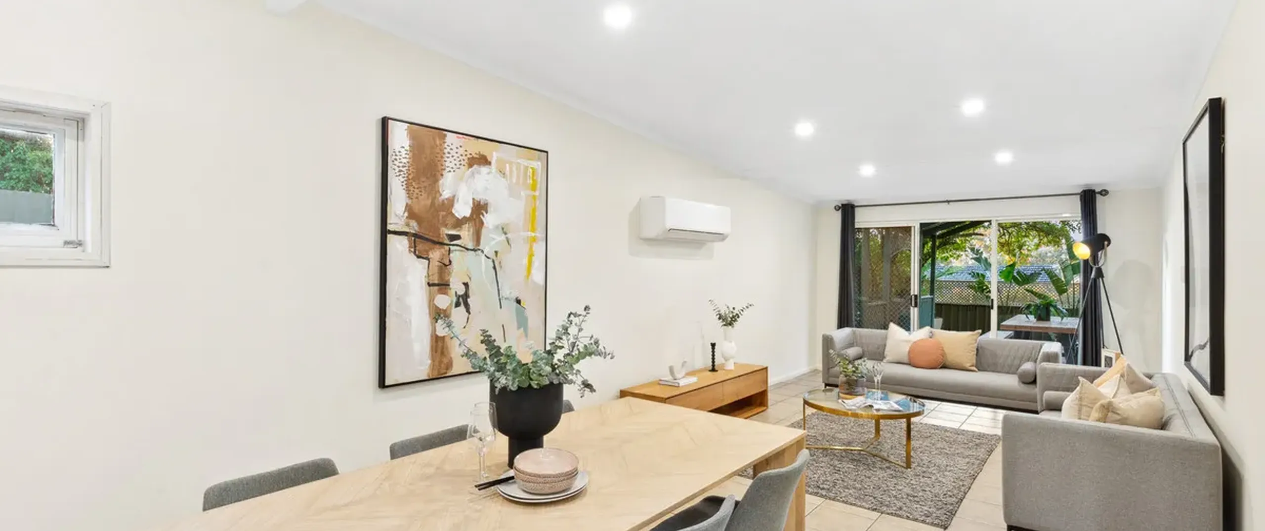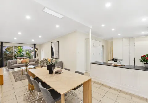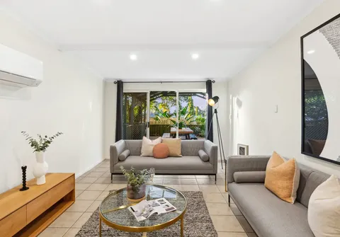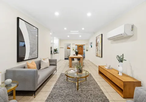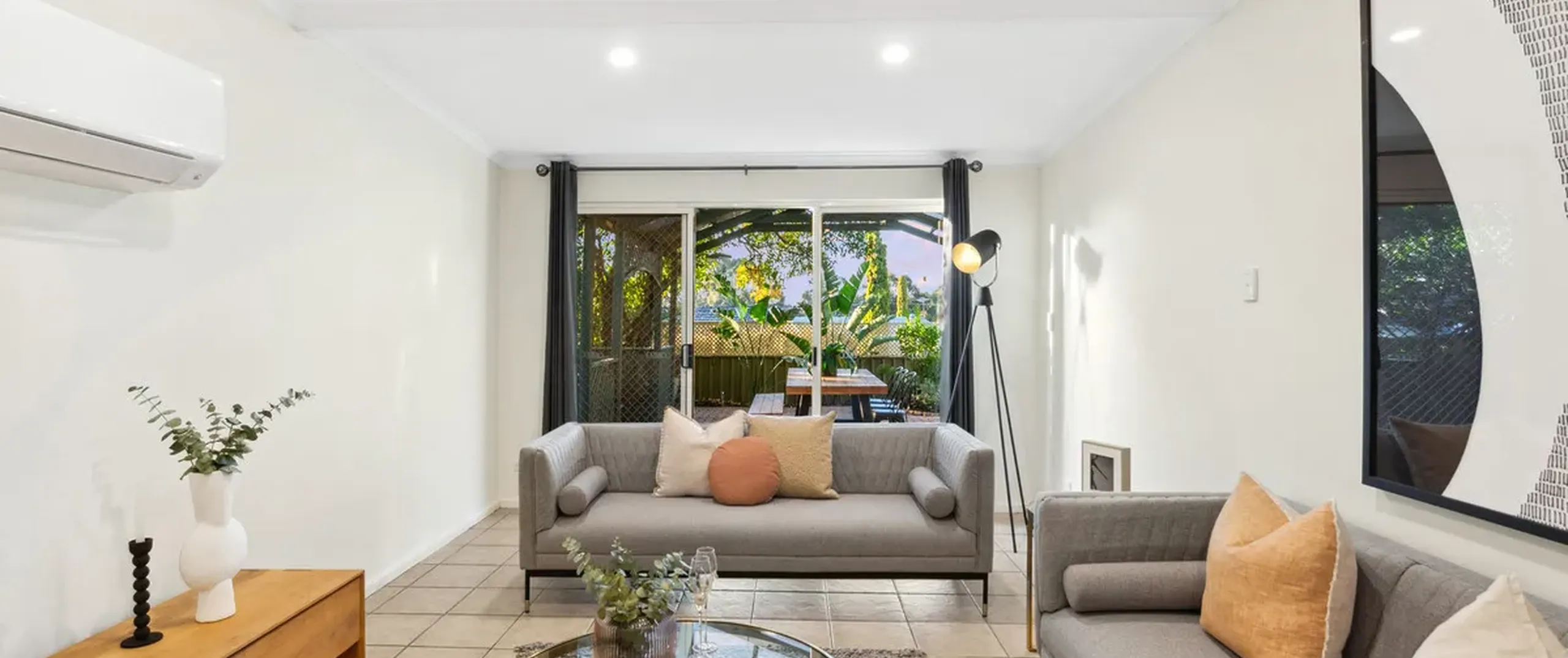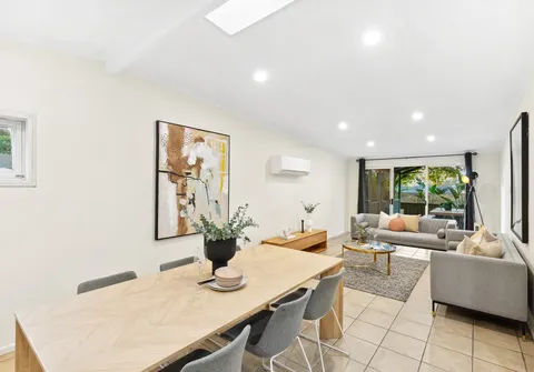 - Light-filled living room with air conditioning, skylight for ample natural lighting and sliding door to outdoor entertaining area