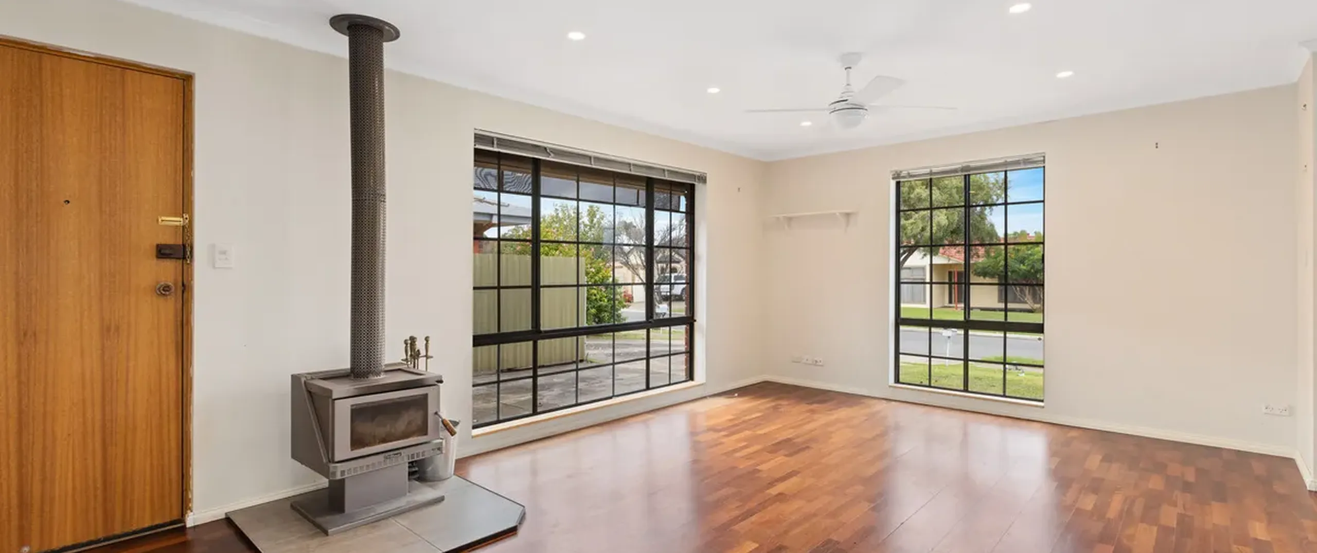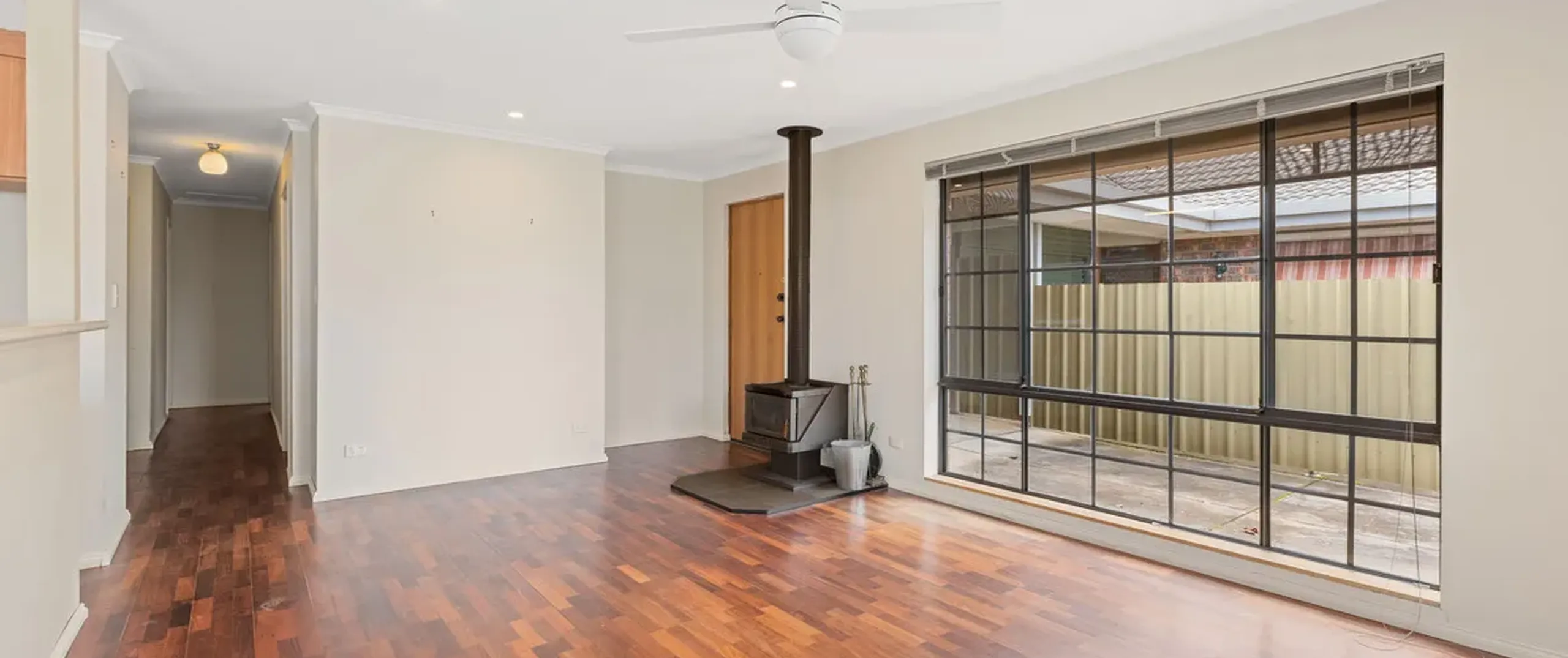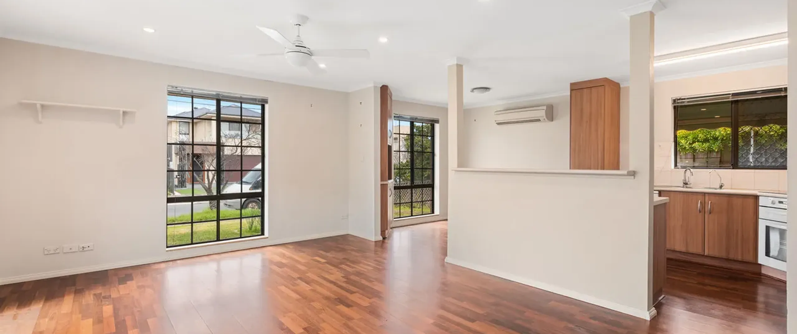 - Spacious light filled living upon entry with a ceiling fan seamlessly connecting to the dining room and kitchen