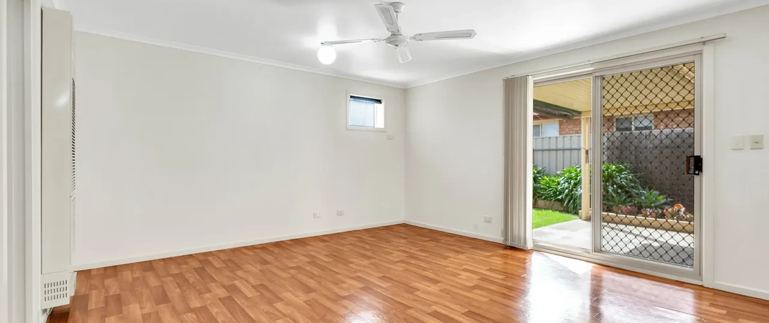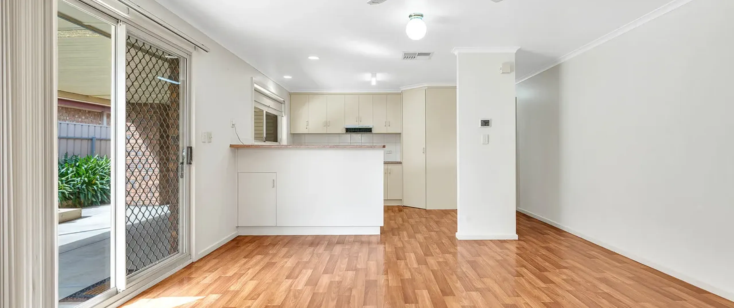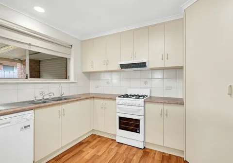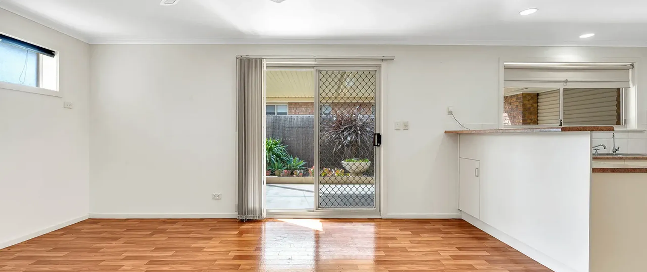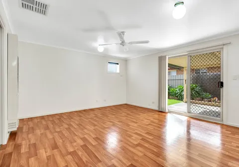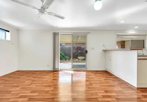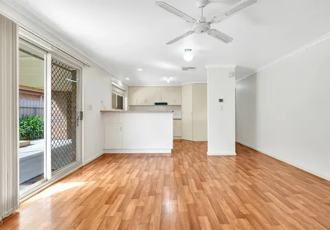 - Light filled open-plan kitchen, living and dining area with ceiling fan, gas heating and glass sliding door opening to the verandah