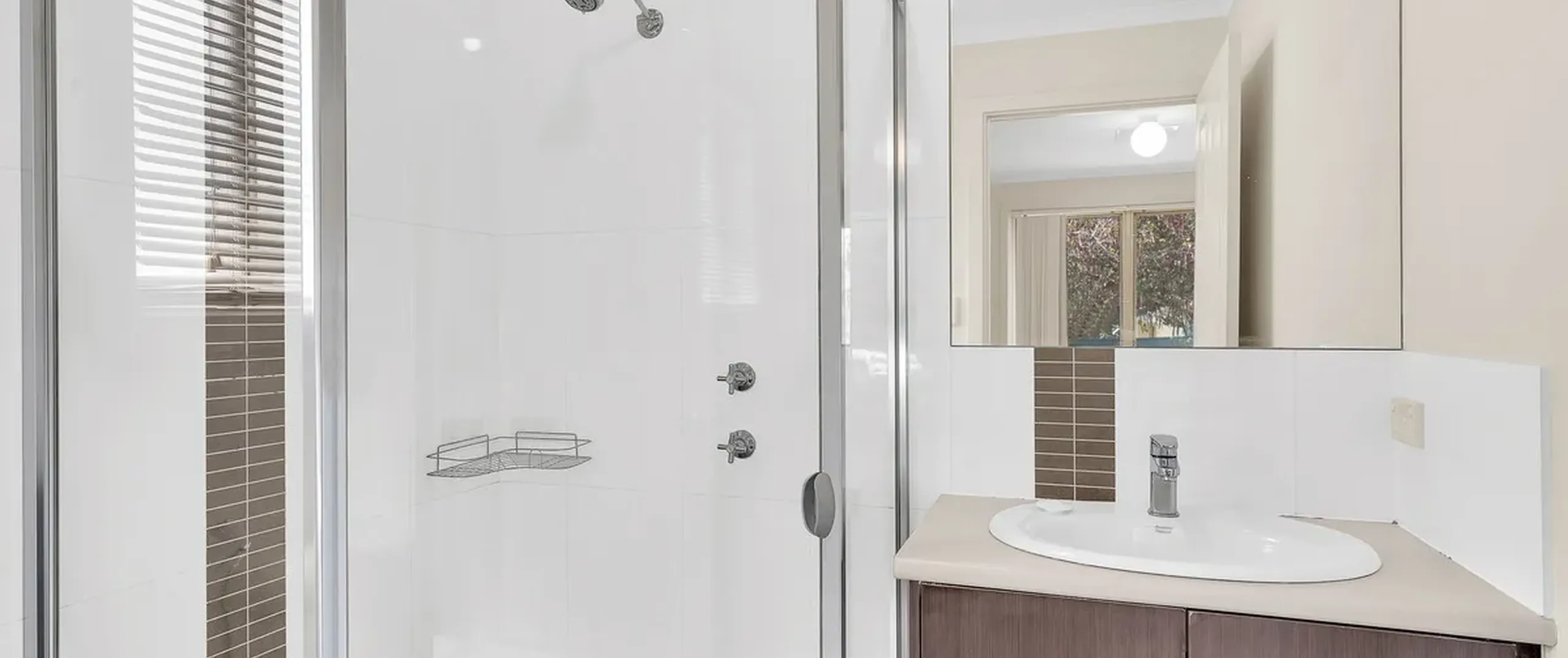 - Modern ensuite with large corner shower with feature tiles, toilet and vanity with additional storage below