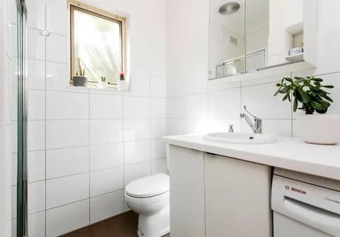 - Modern bathroom with mirrored storage and under vanity storage + laundry facilities
