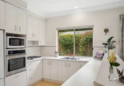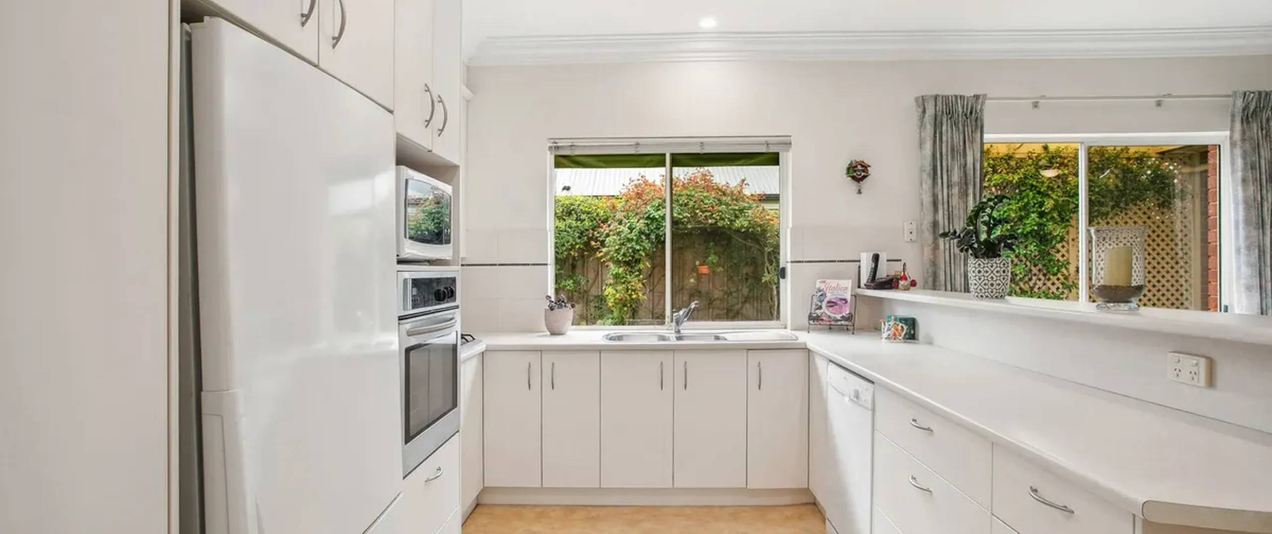 - Timeless white kitchen with gas cook top, electric oven and cupboard and bench space