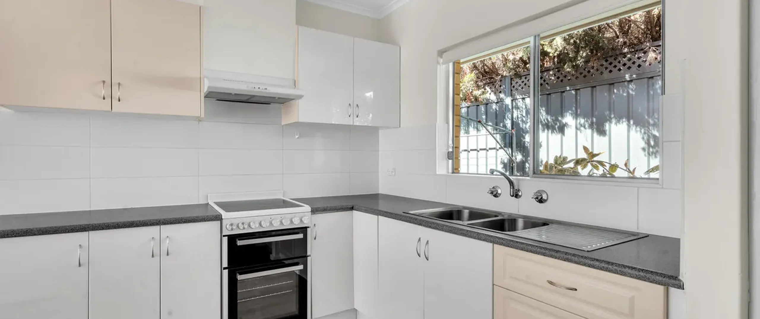 - Contemporary renovated kitchen complete with new stove, electric oven, dual sink, built in pantry and ample cupboard and bench space