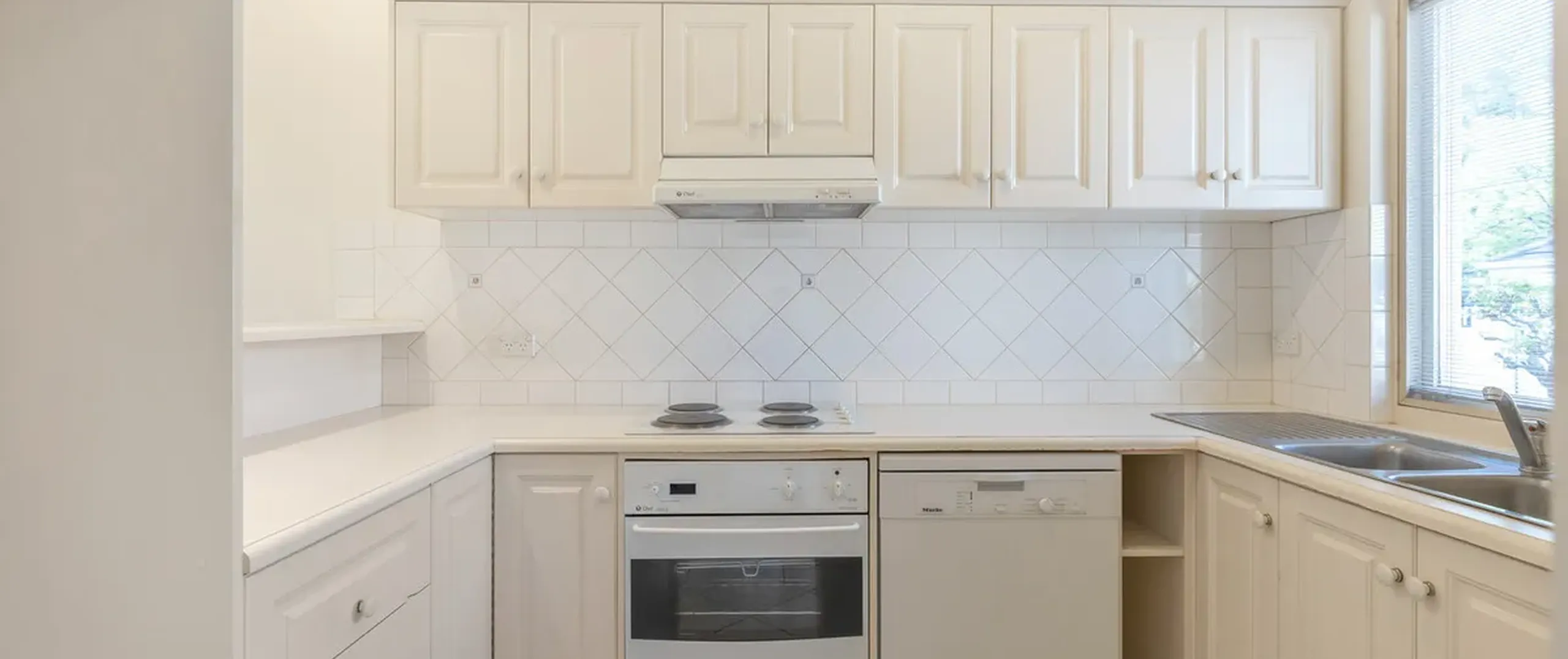 - Modern kitchen with generous cupboard and bench space, double sink and electric cooking