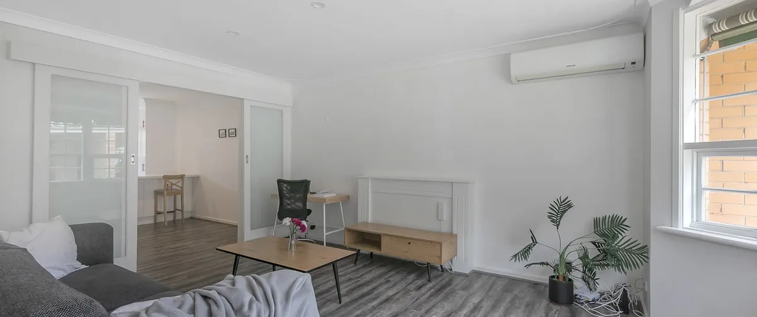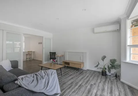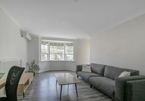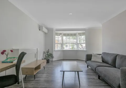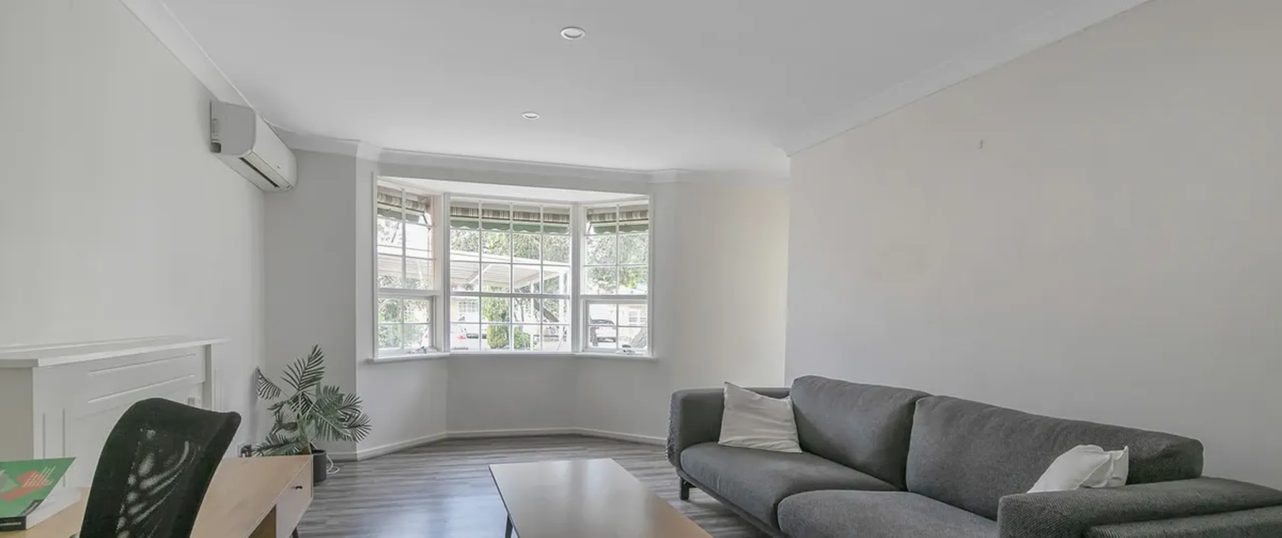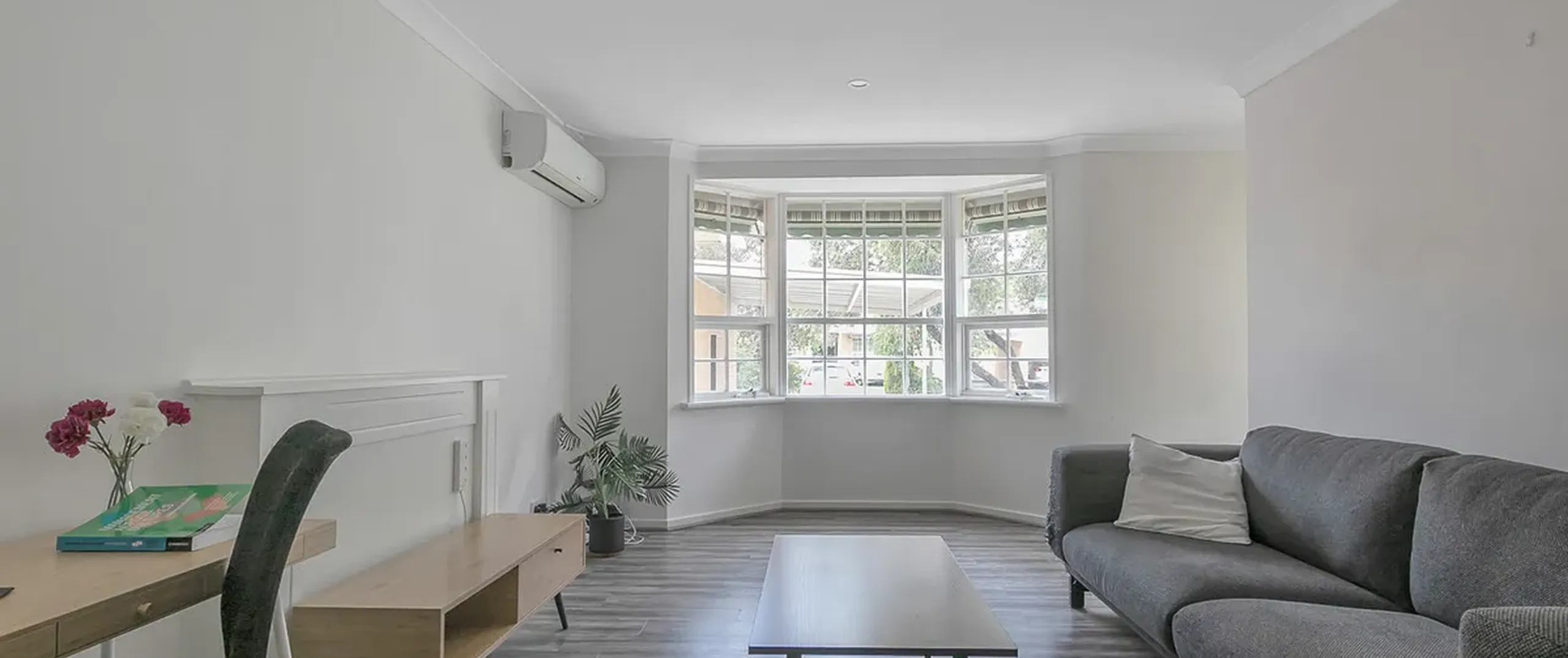 - Light filled living room with bay window and split system reverse cycle air conditioner for year round comfort