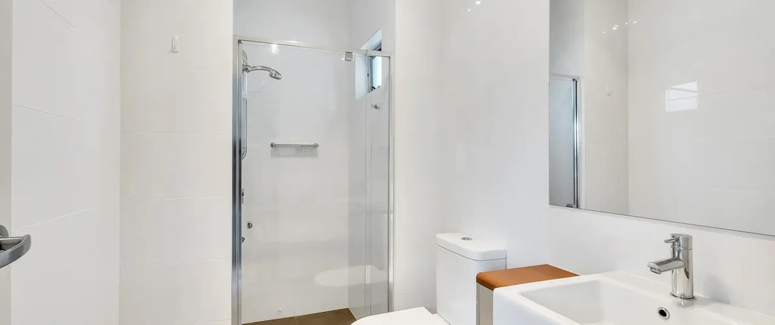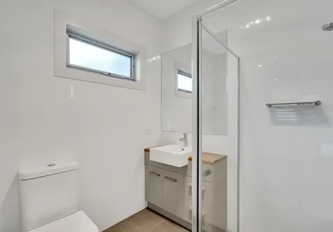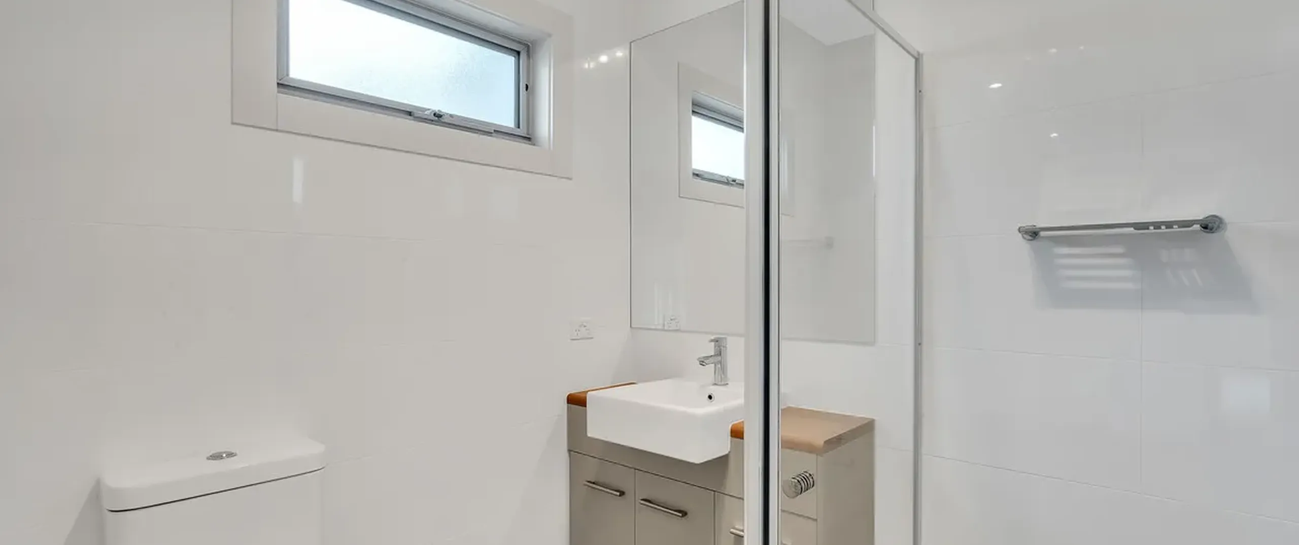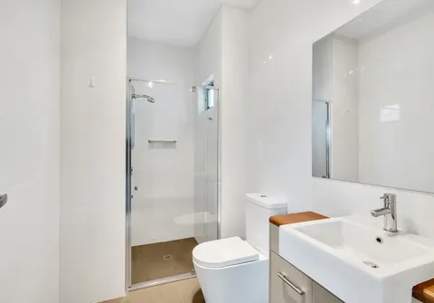 - Modern bathroom with mirrored vanity and under bench cupboards