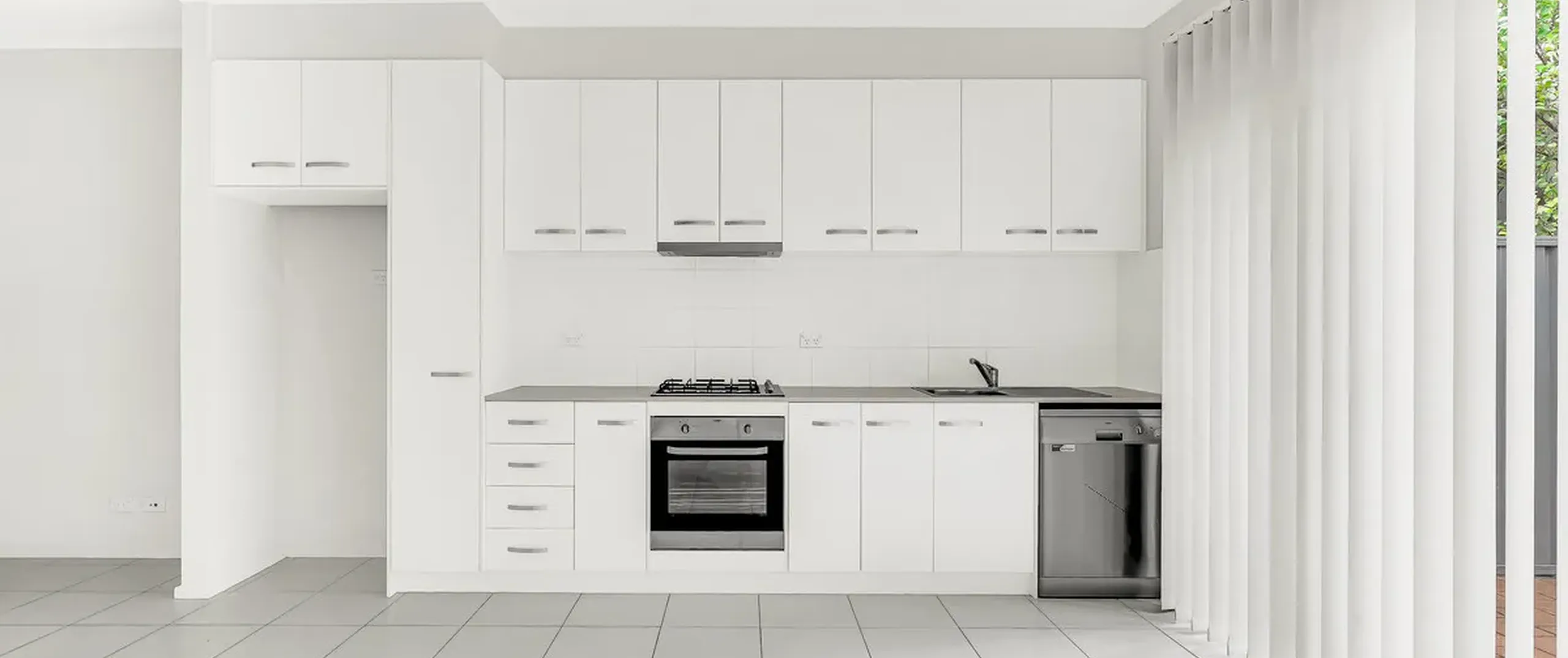 - Modern kitchen with gas cooktop, electric oven, dishwasher, stone benchtop and ample cupboard storage