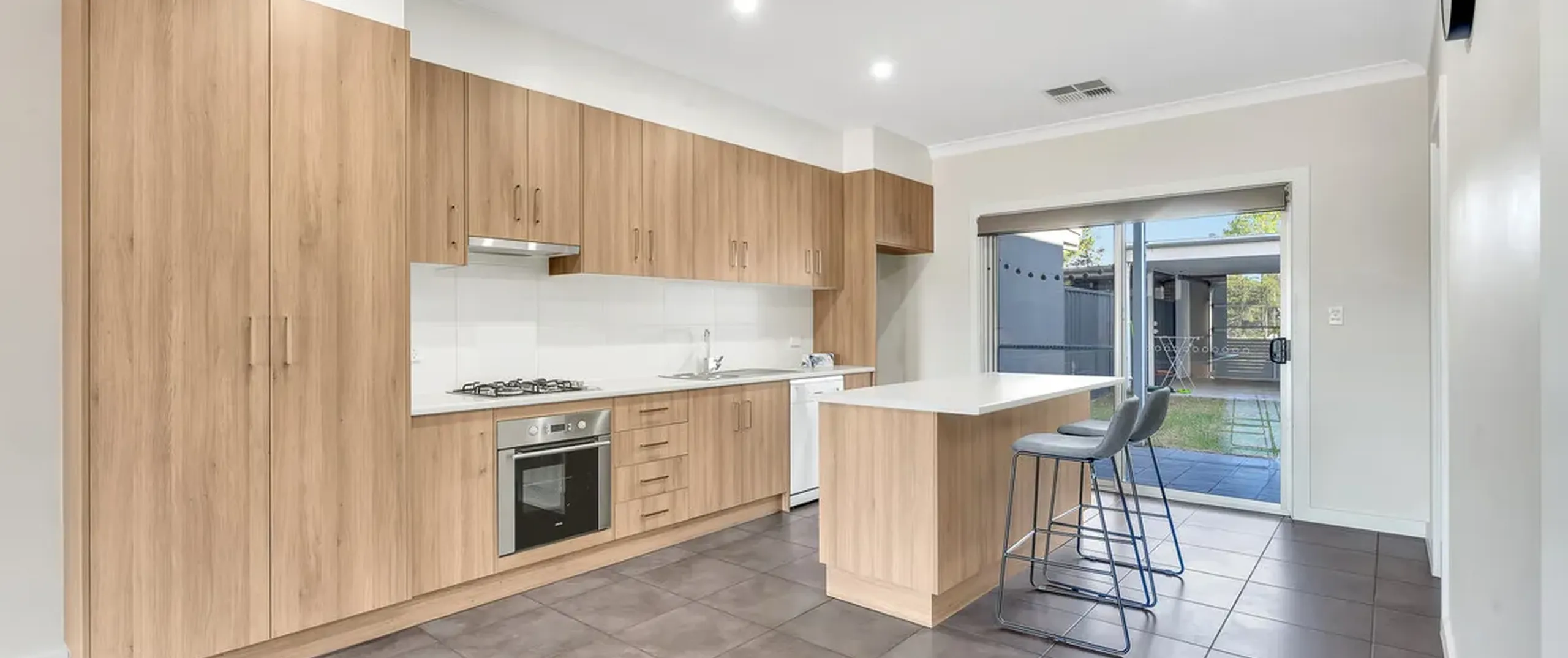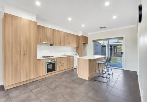 - Stylish kitchen with gas cooktop, dishwasher and ample cupboard and bench space and a movable island bench