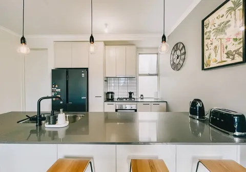 - Modern kitchen with island bench and breakfast bar, overhead cupboards, corner walk-in pantry stainless steel oven and dishwasher