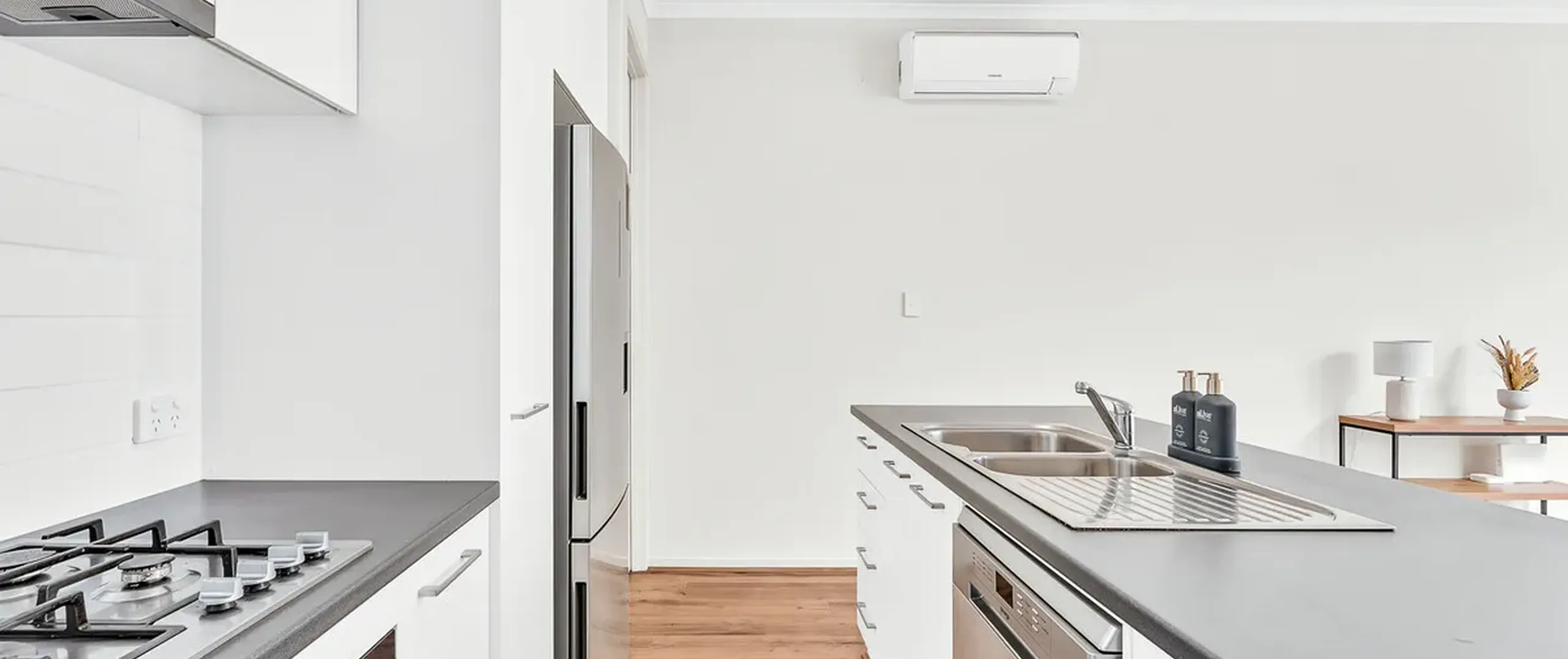 - Stylish modern kitchen with gas cooktop, dishwasher and ample cupboard and bench space