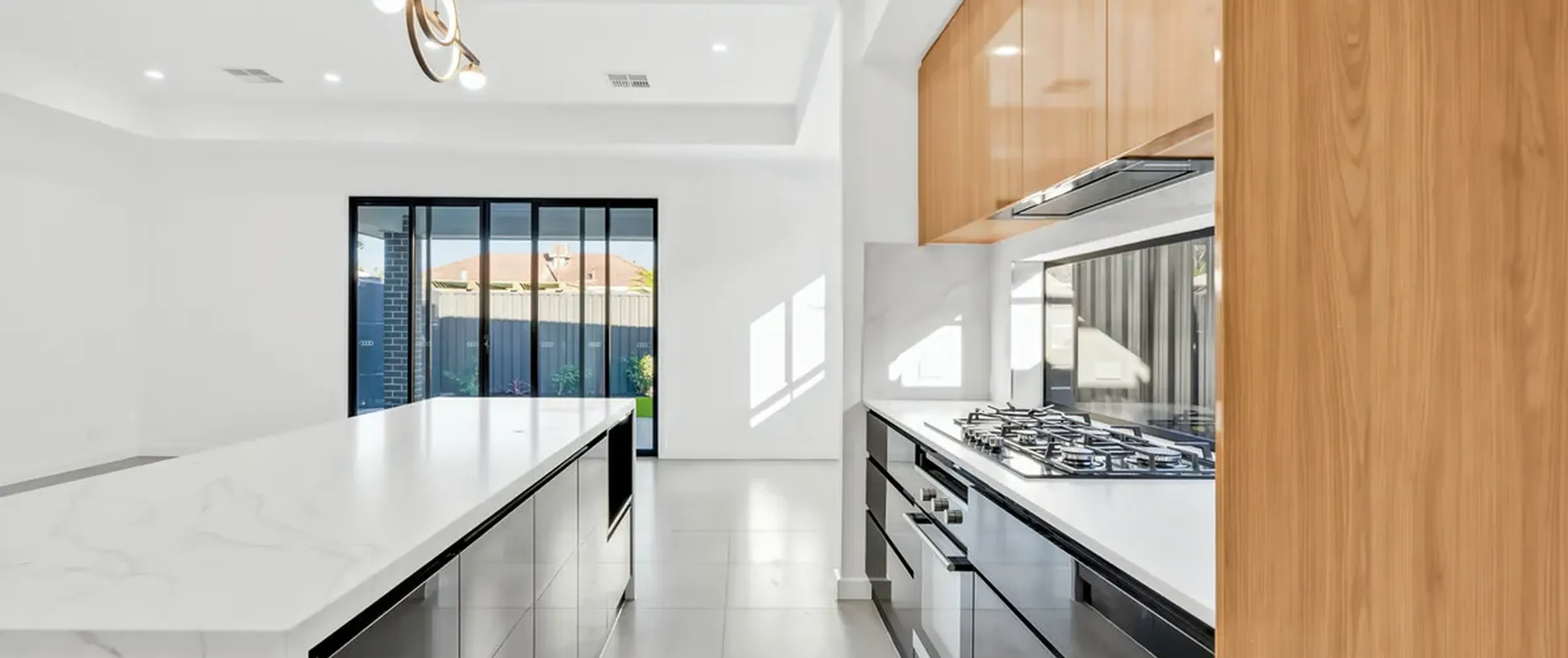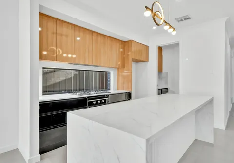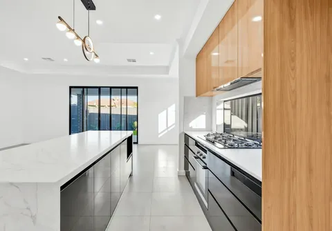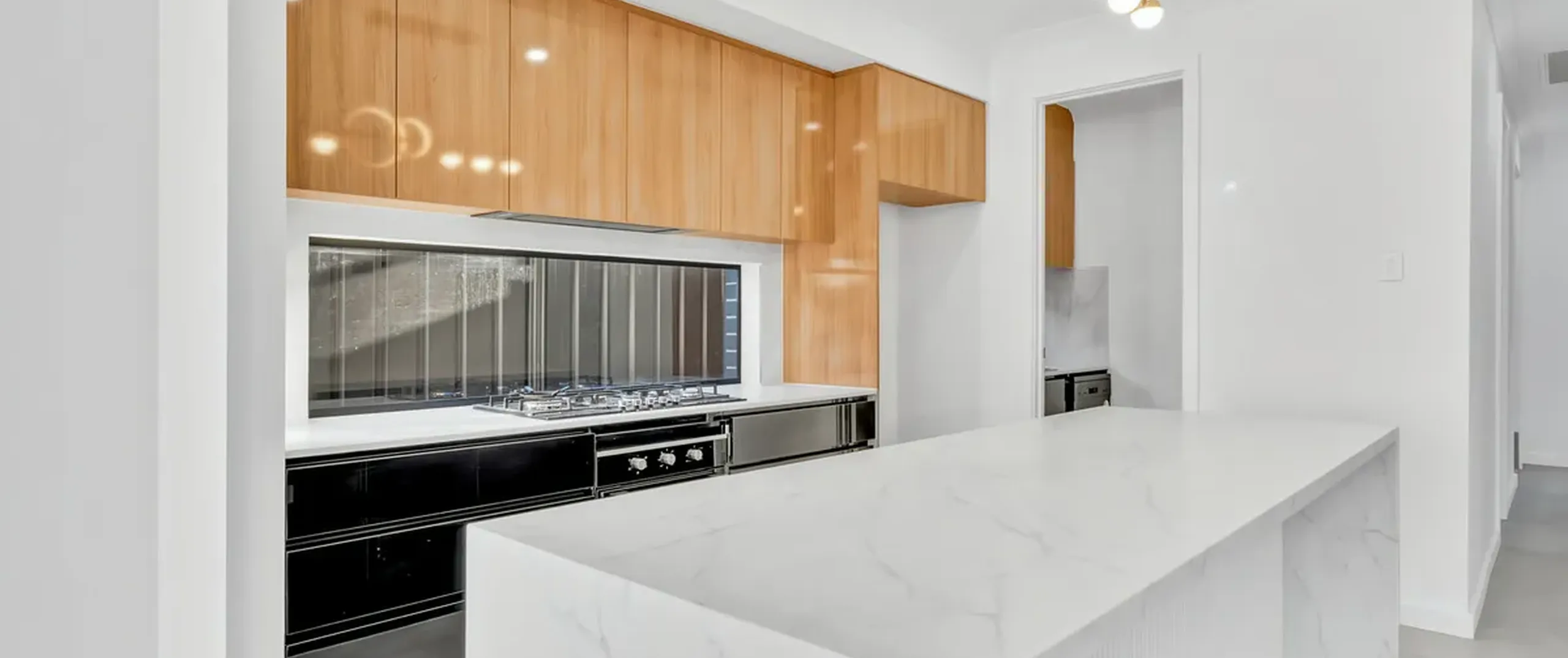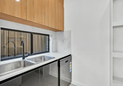 - Sleek modern kitchen with 900mm gas cooktop, high gloss cabinetry, 40mm stone bench tops, built in wine rack, waterfall island bench and butlers pantry with dishwasher and wet area