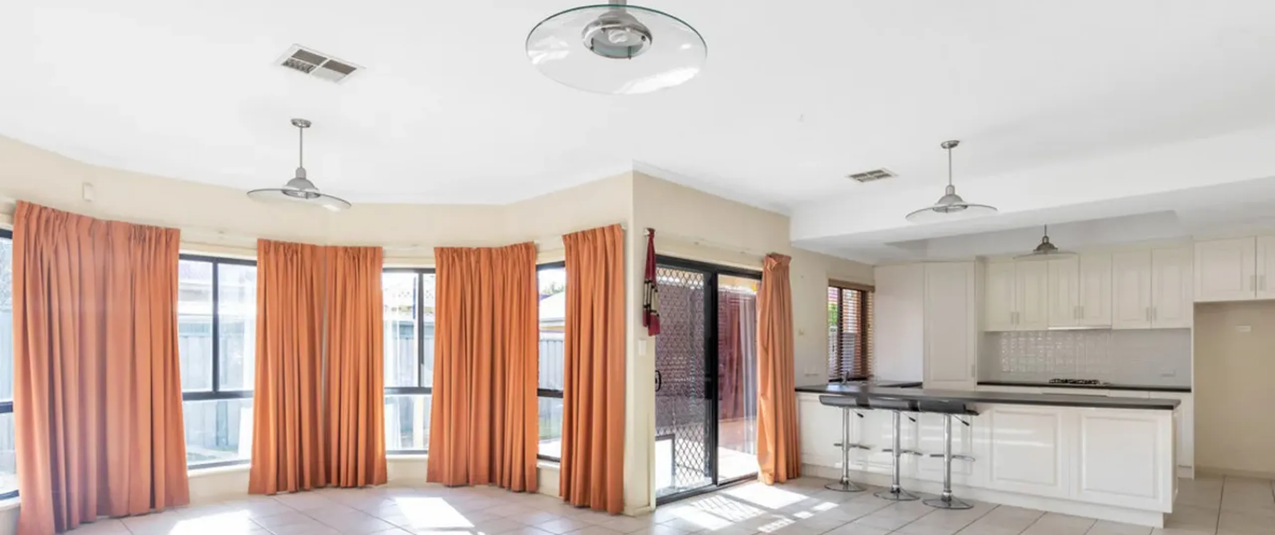 - Large open plan tiled casual meal and bay windowed living area overlooked by the kitchen