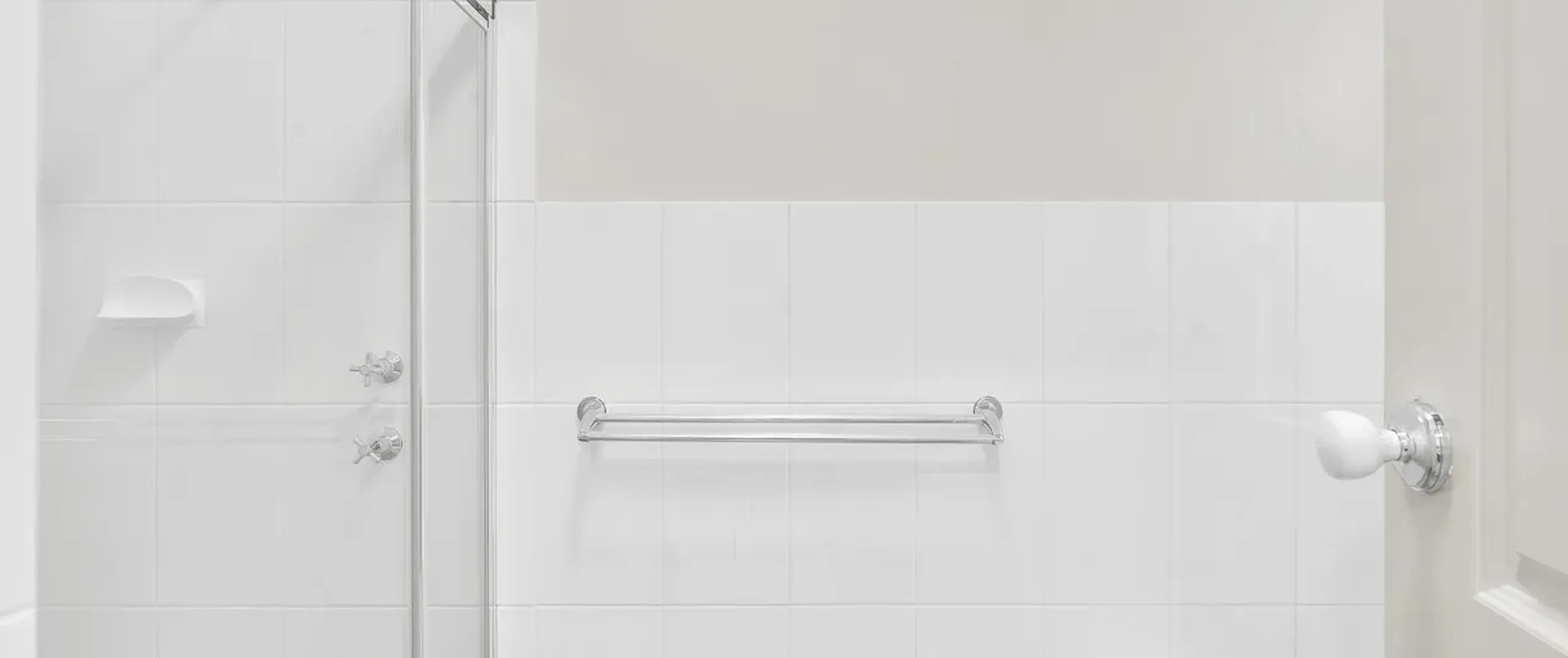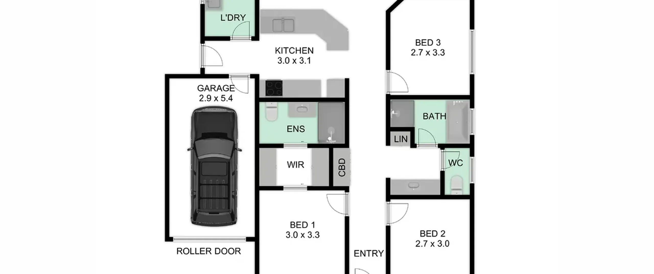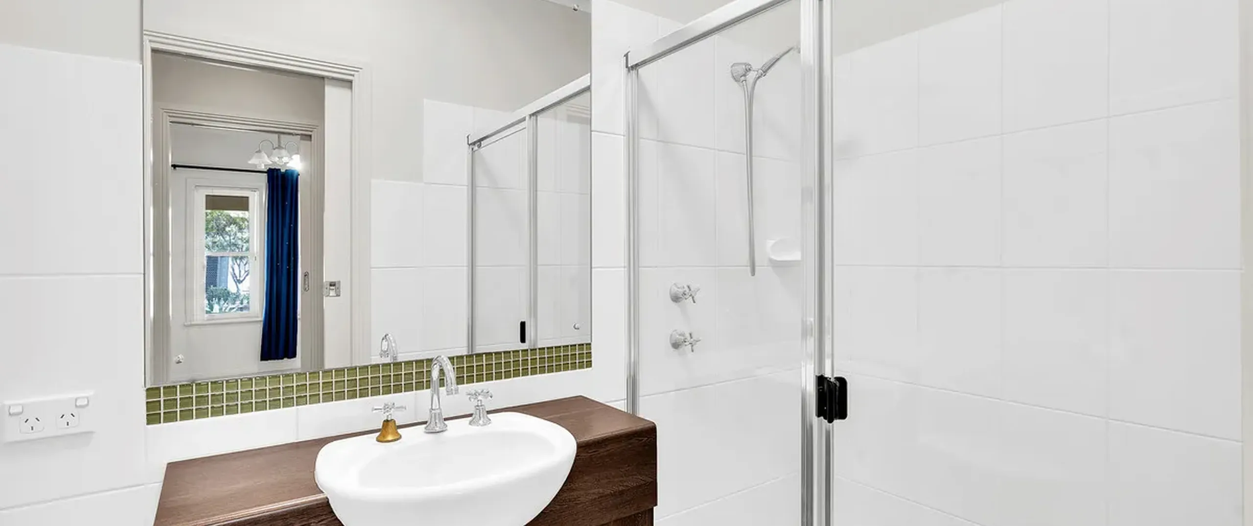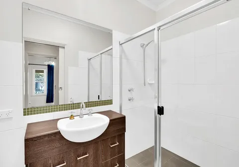 - Modern ensuite with large corner shower, toilet and vanity with additional storage space below