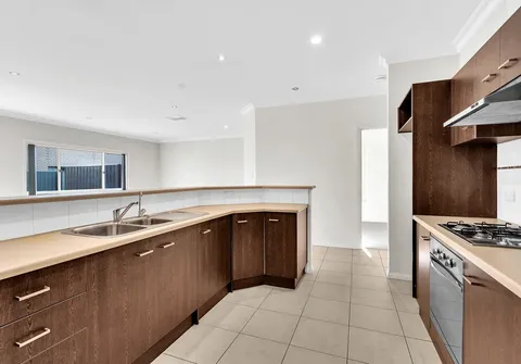 - Modern kitchen with gas cook top, electric oven, dual sink, high breakfast bar complete with ample cupboard and bench space