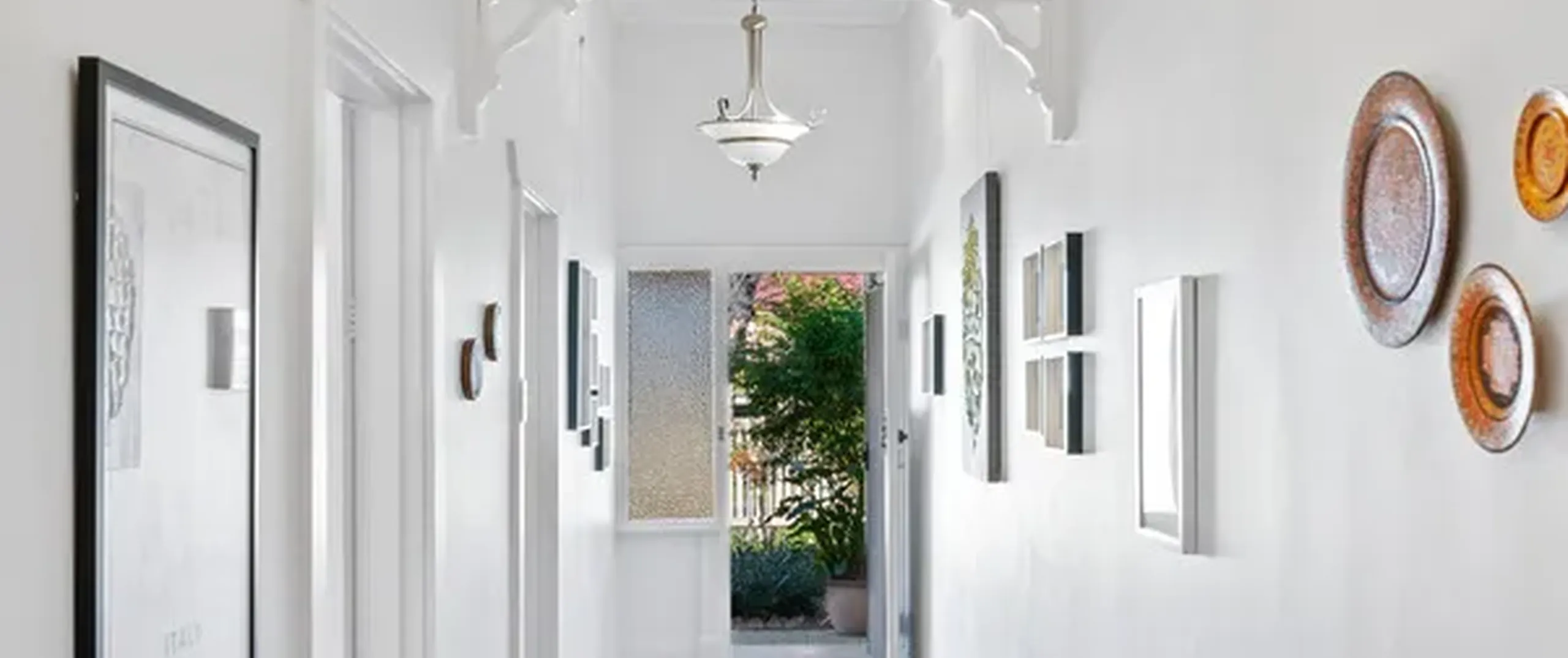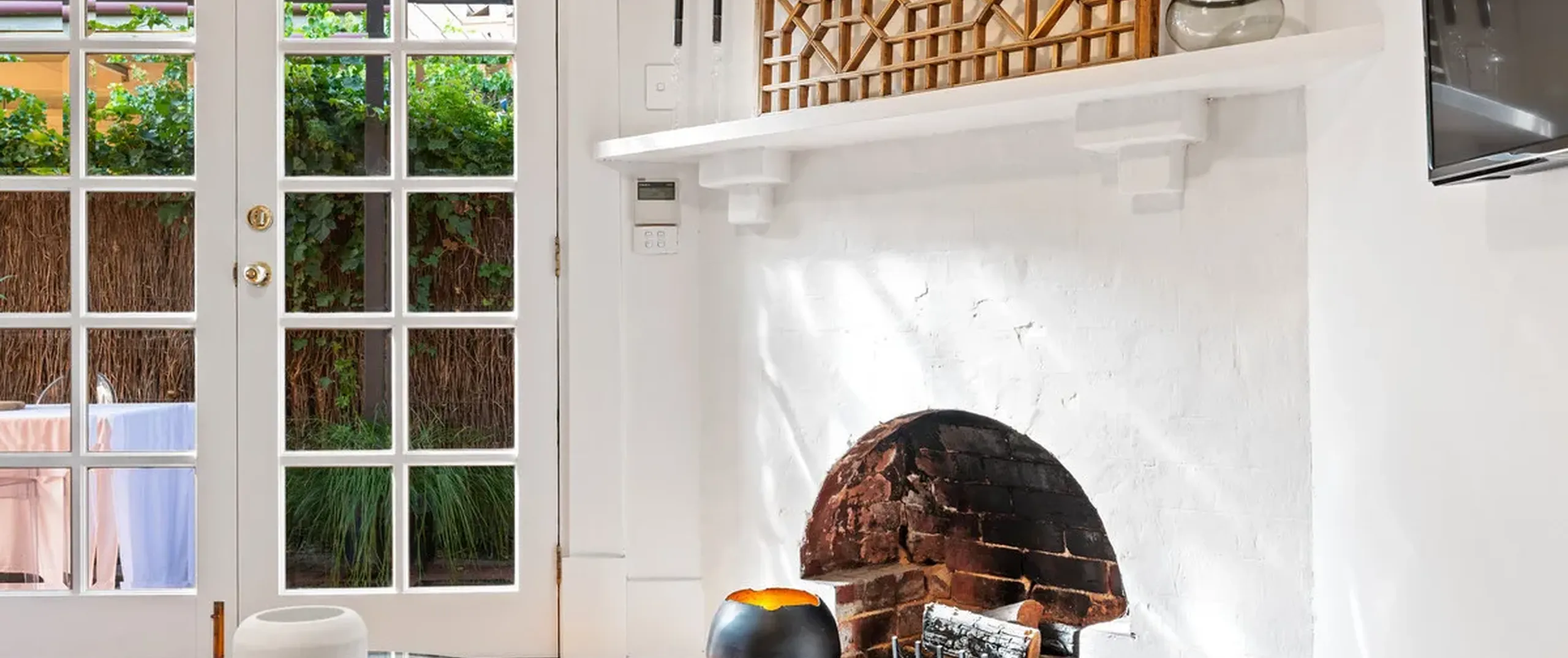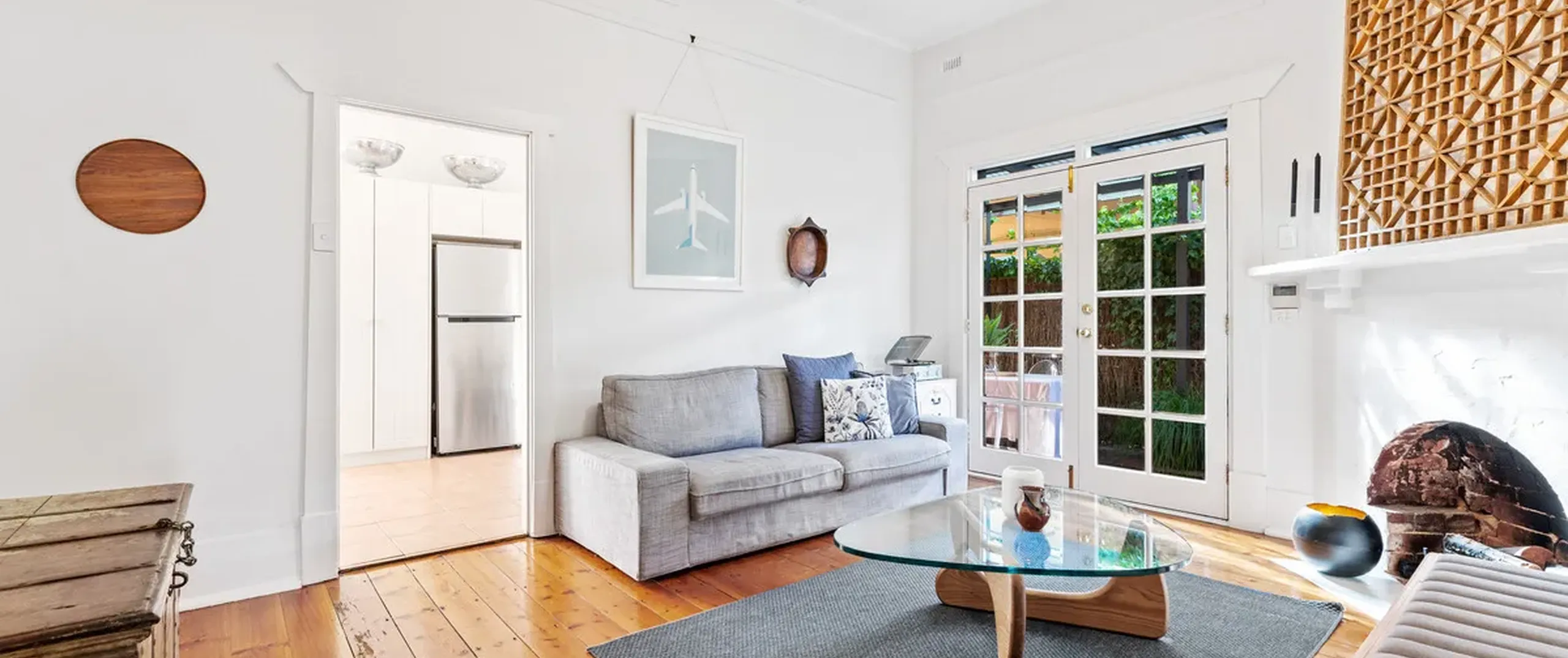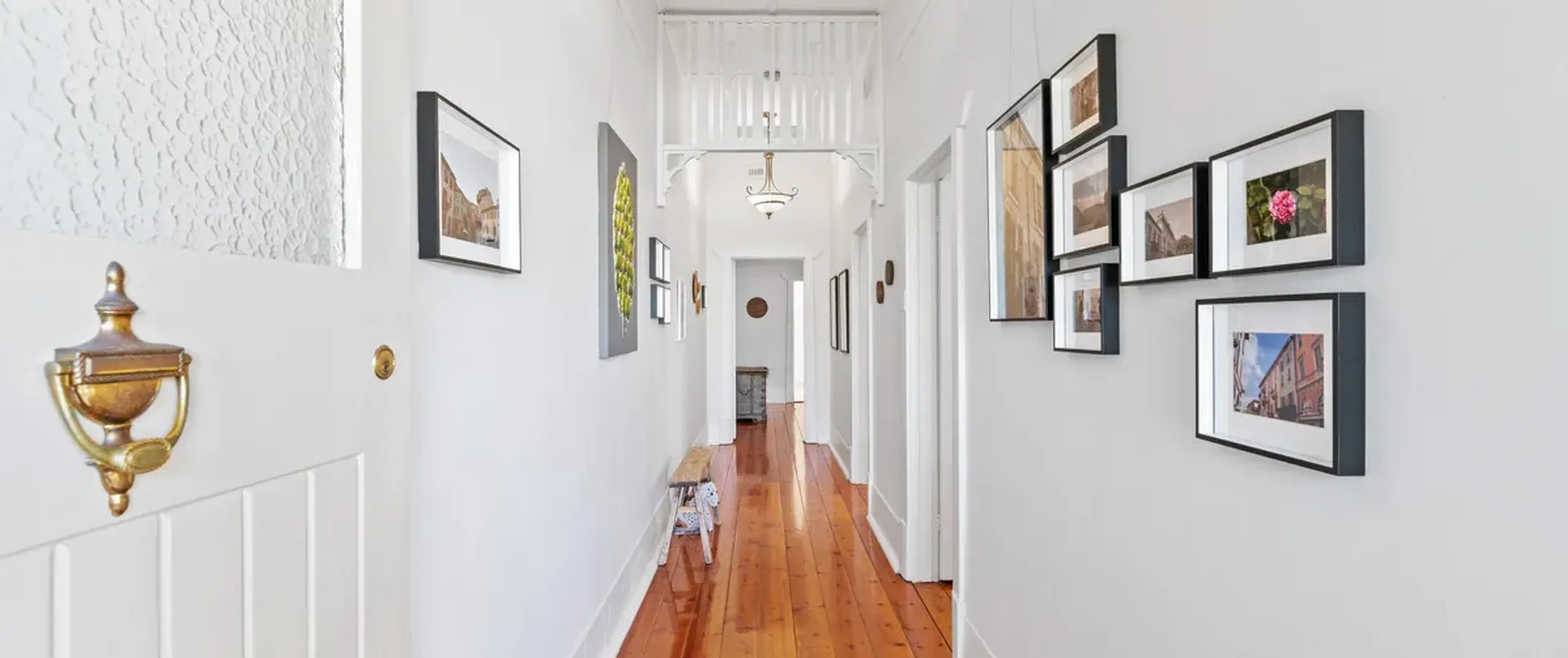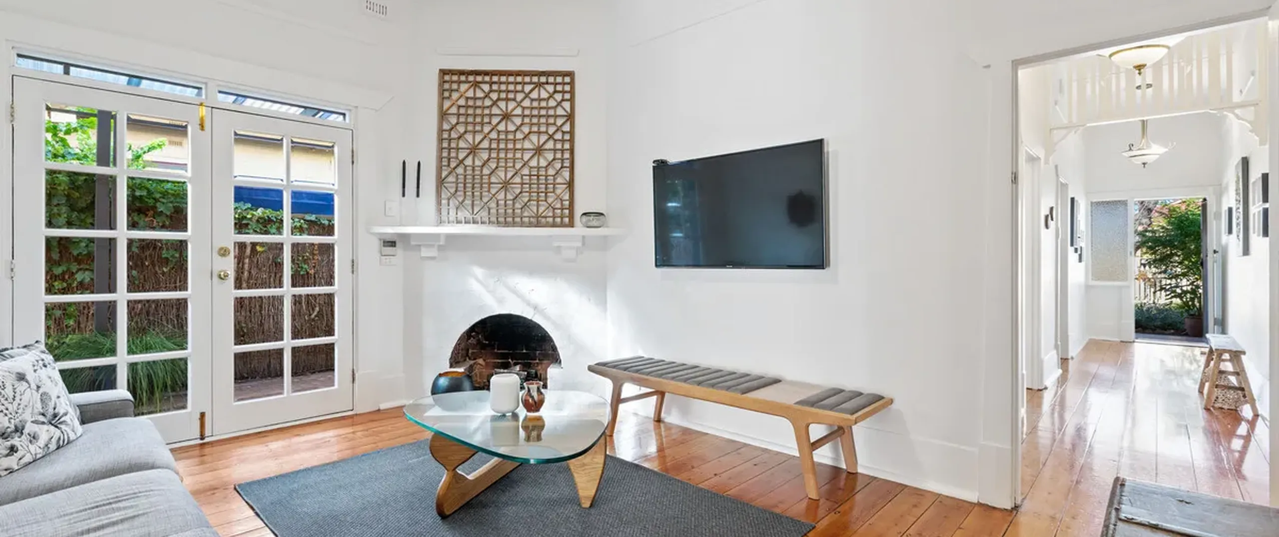 A gorgeous hallway with timber floors and ornate fretwork flows through to the light-filled lounge room with an original brick fireplace and French doors that lead out to the entertainer’s courtyard.