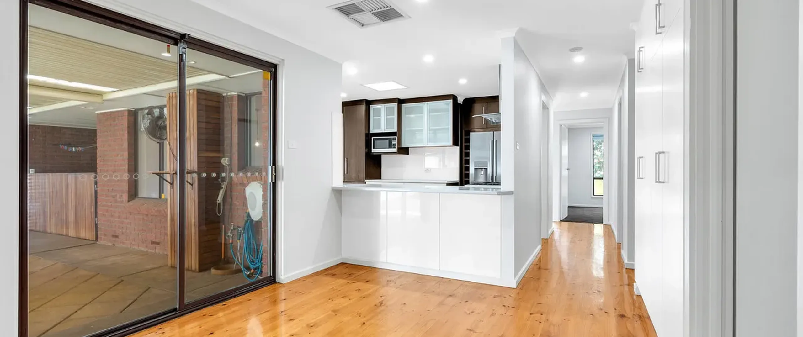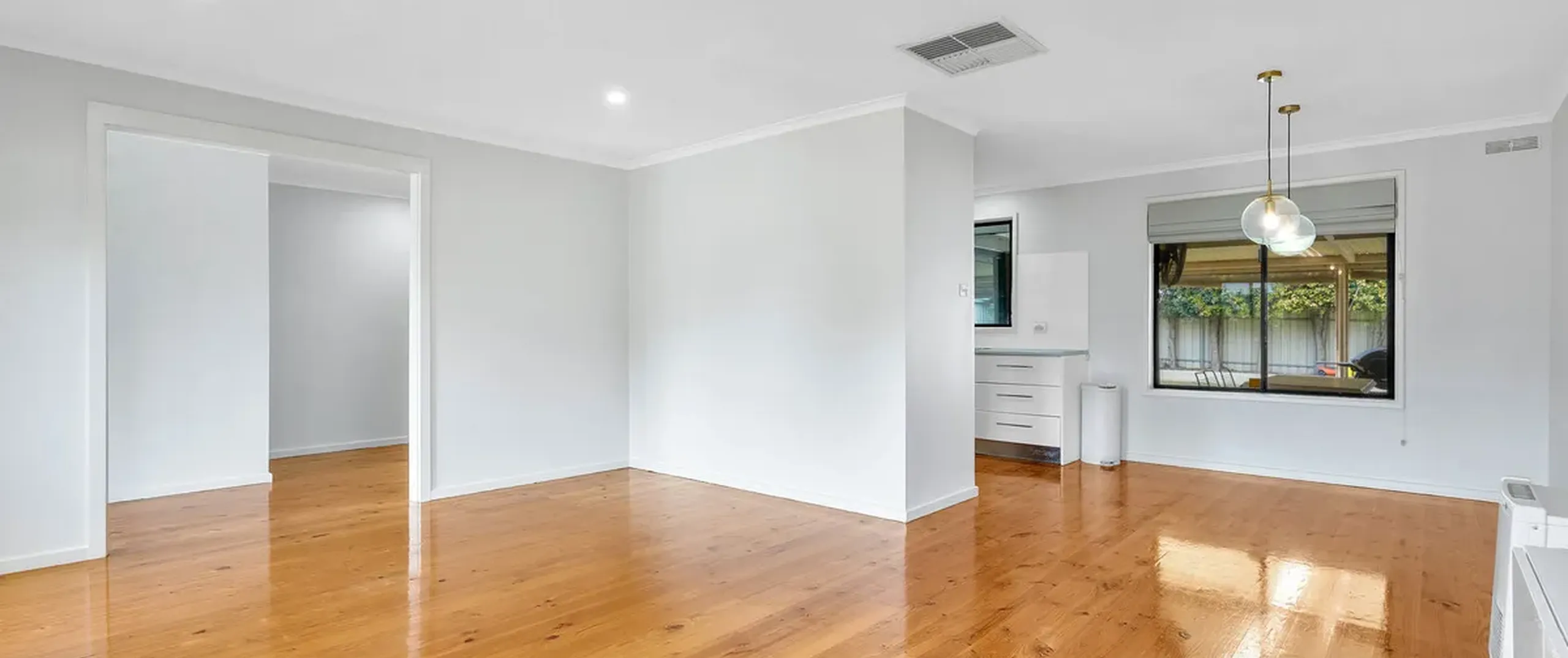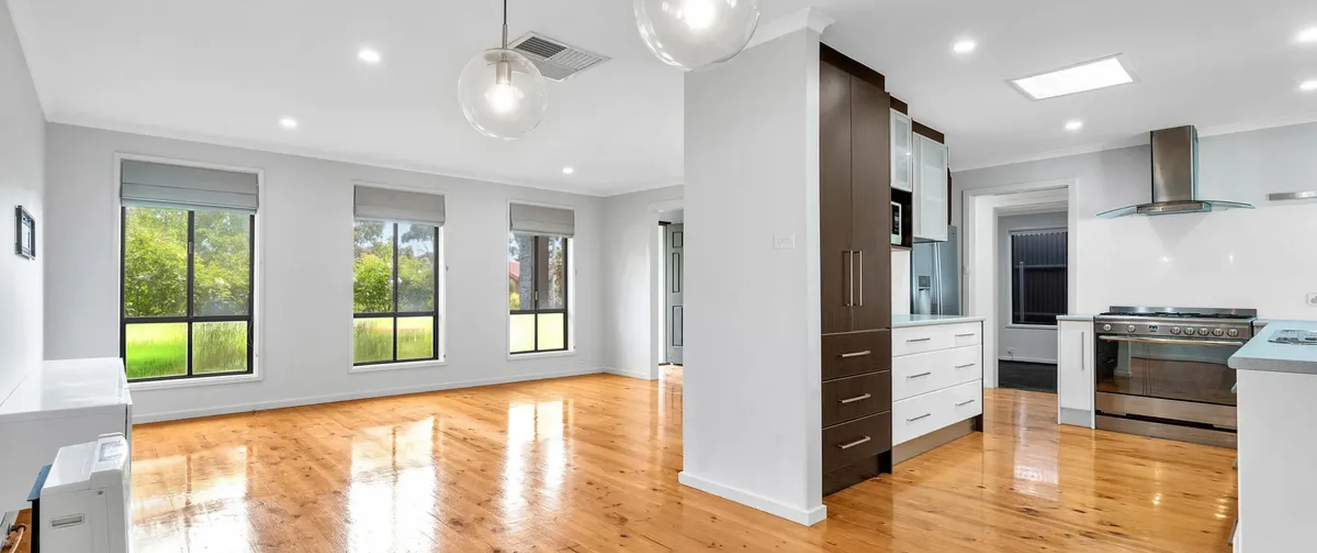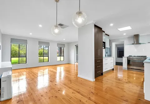 - Spacious kitchen, living and dining area with polished floorboards throughout