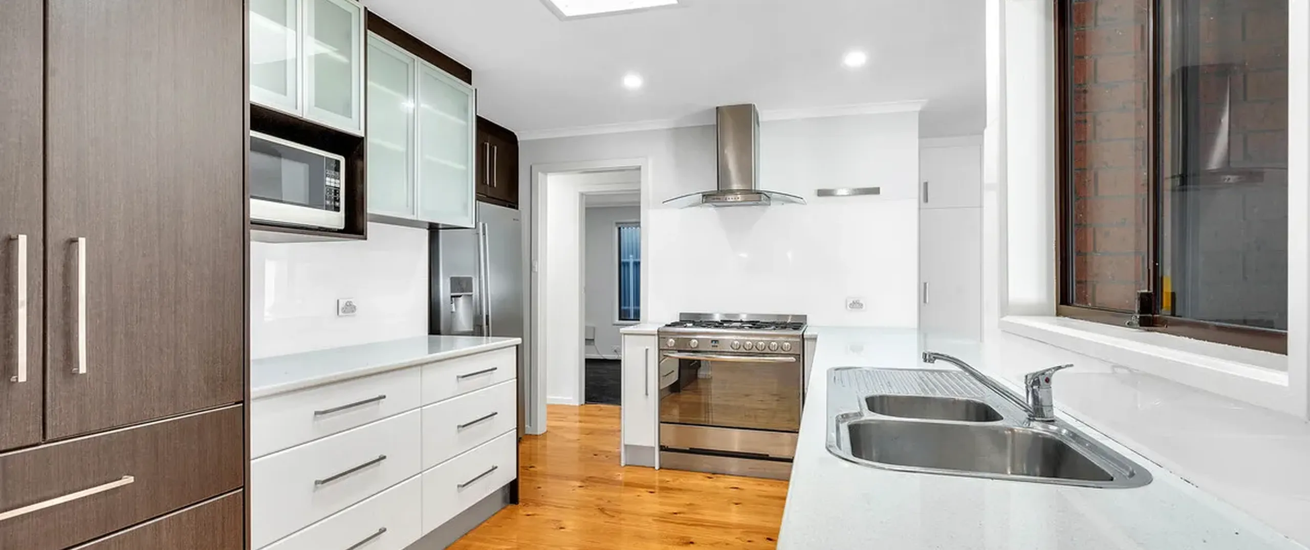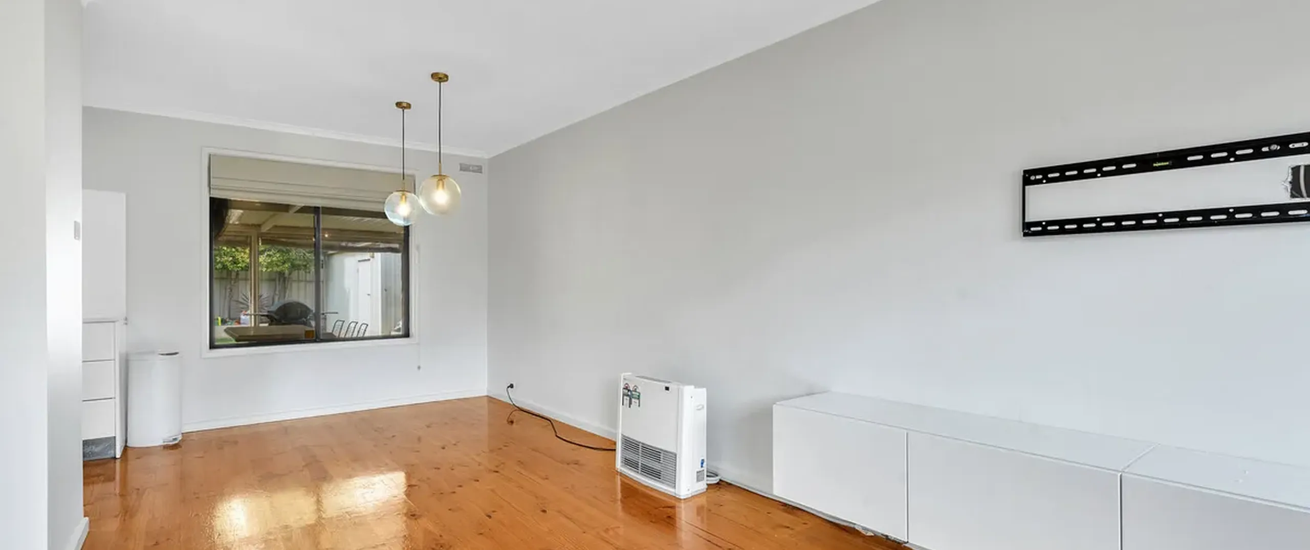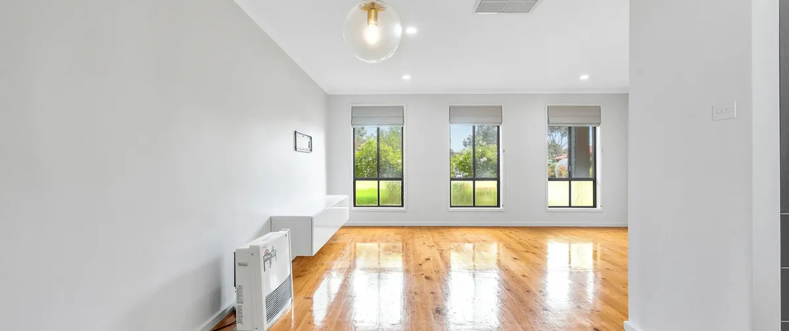 - Spacious kitchen, living and dining area with polished floorboards throughout