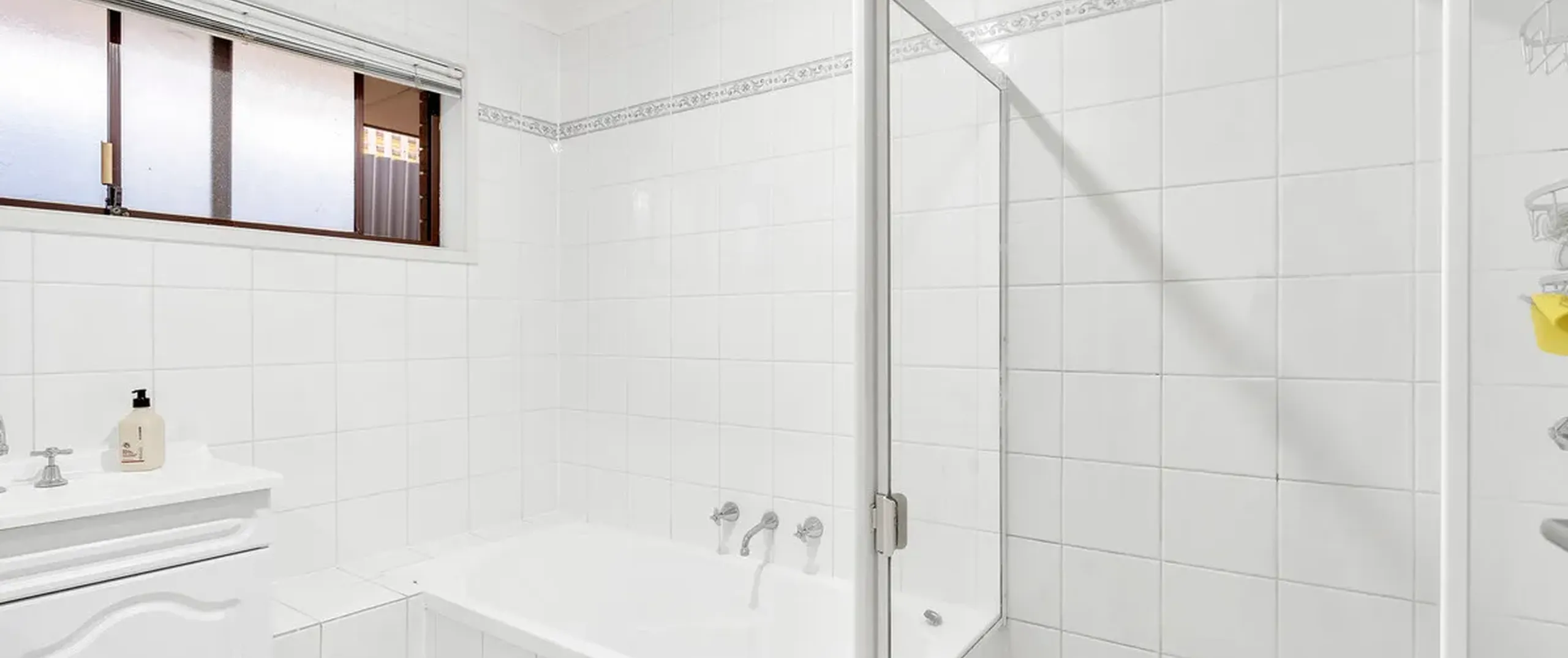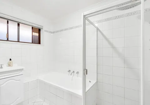 - Neat and tidy main bathroom with separate bath and shower and vanity with below storage