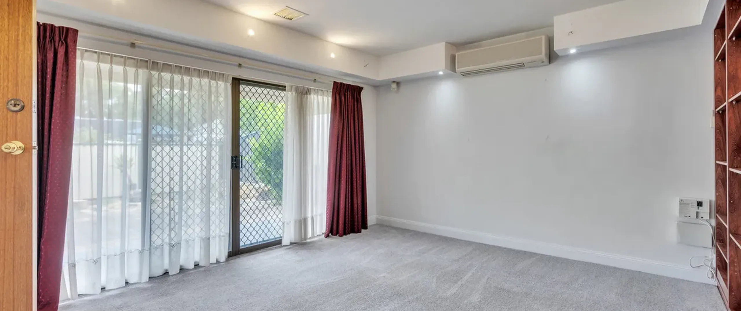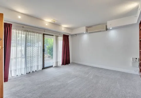 - Light-filled living area with wall length shelving storage, split system air conditioner and direct access to front yard