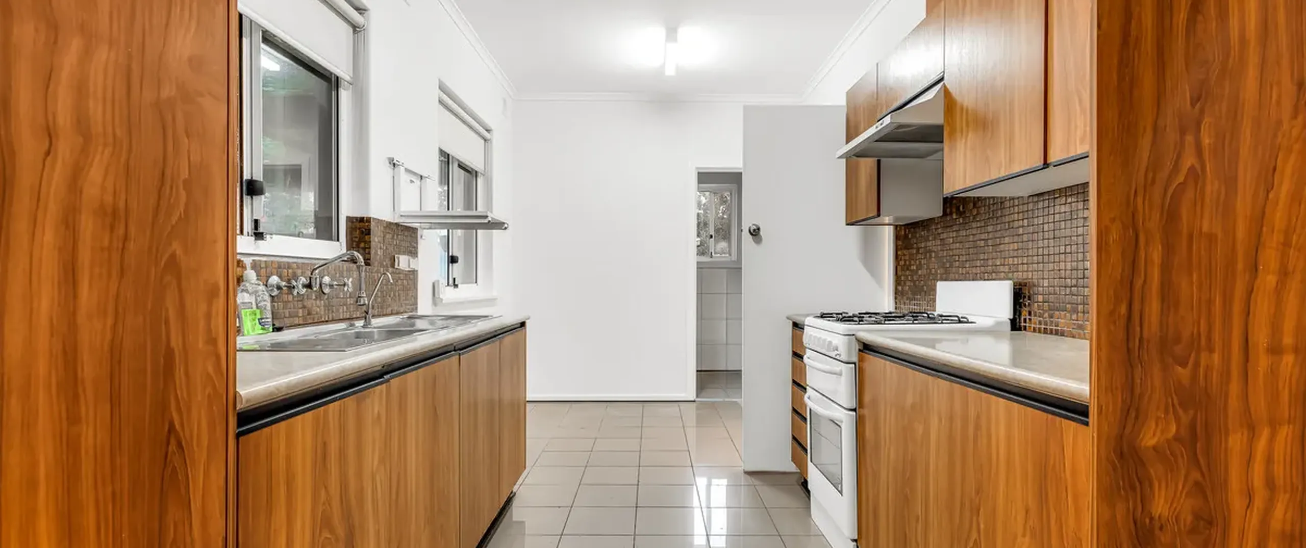 - Timber kitchen with gas cooking, ample cupboard space and dual sink
