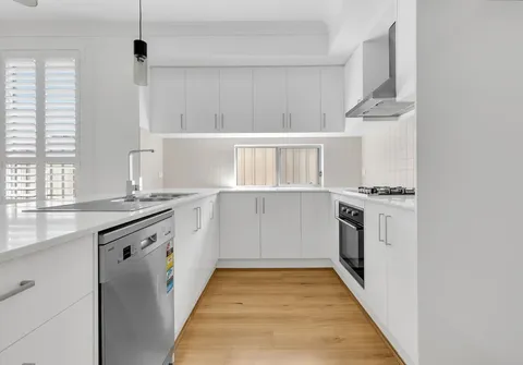- Designer kitchen with stone bench tops, gas cooktop, double sink, dishwasher and ample storage and bench space