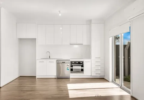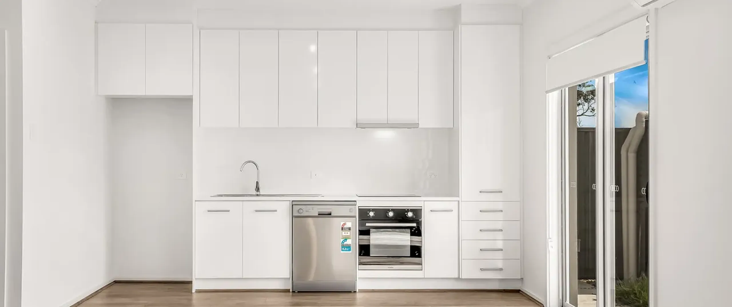 - Modern one-wall kitchen with stainless steel dishwasher and oven, complete with ample cupboard space