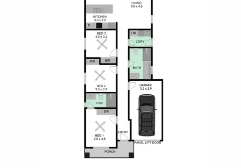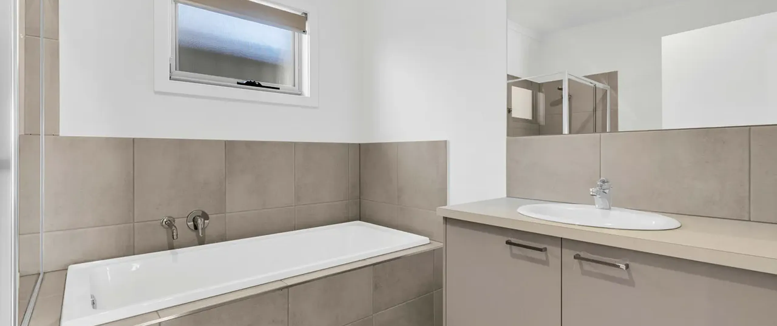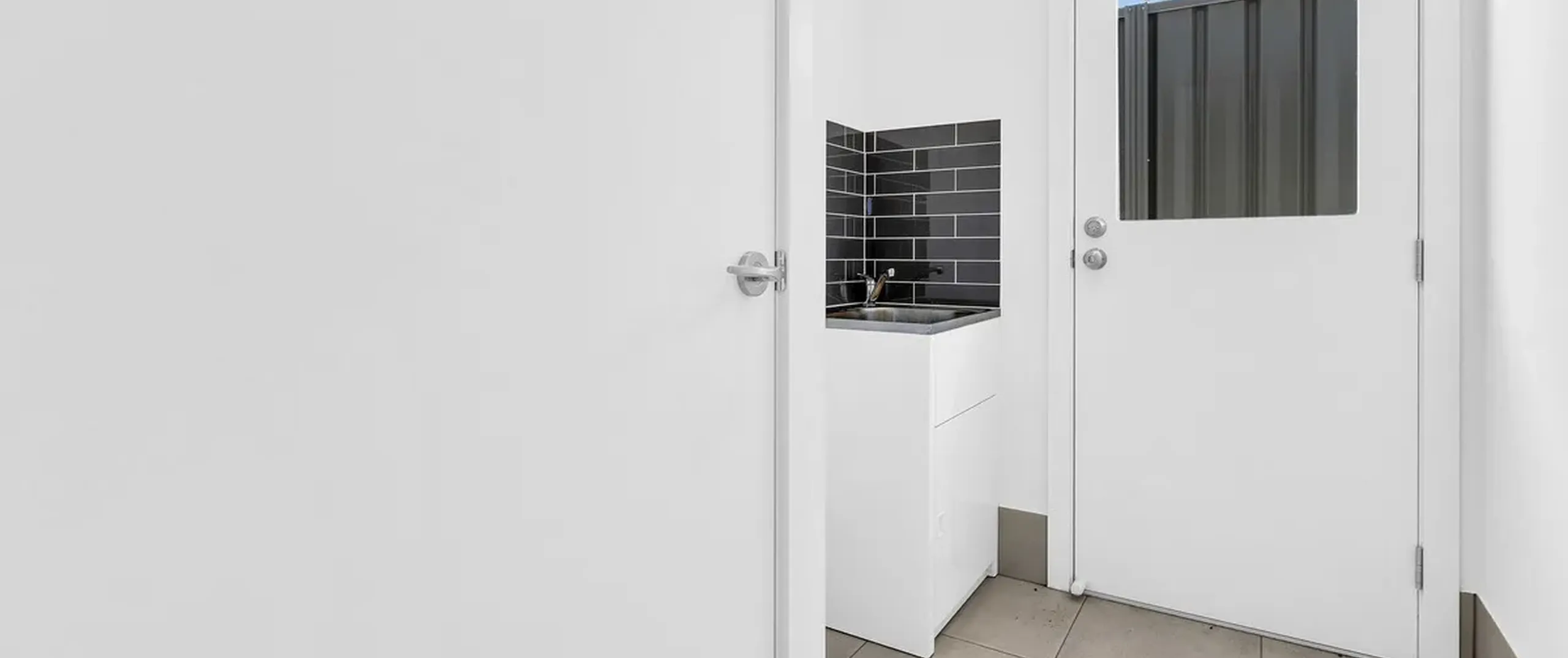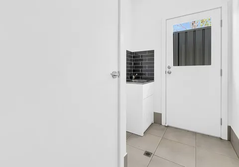 - Functional laundry with built-in cupboards and external access