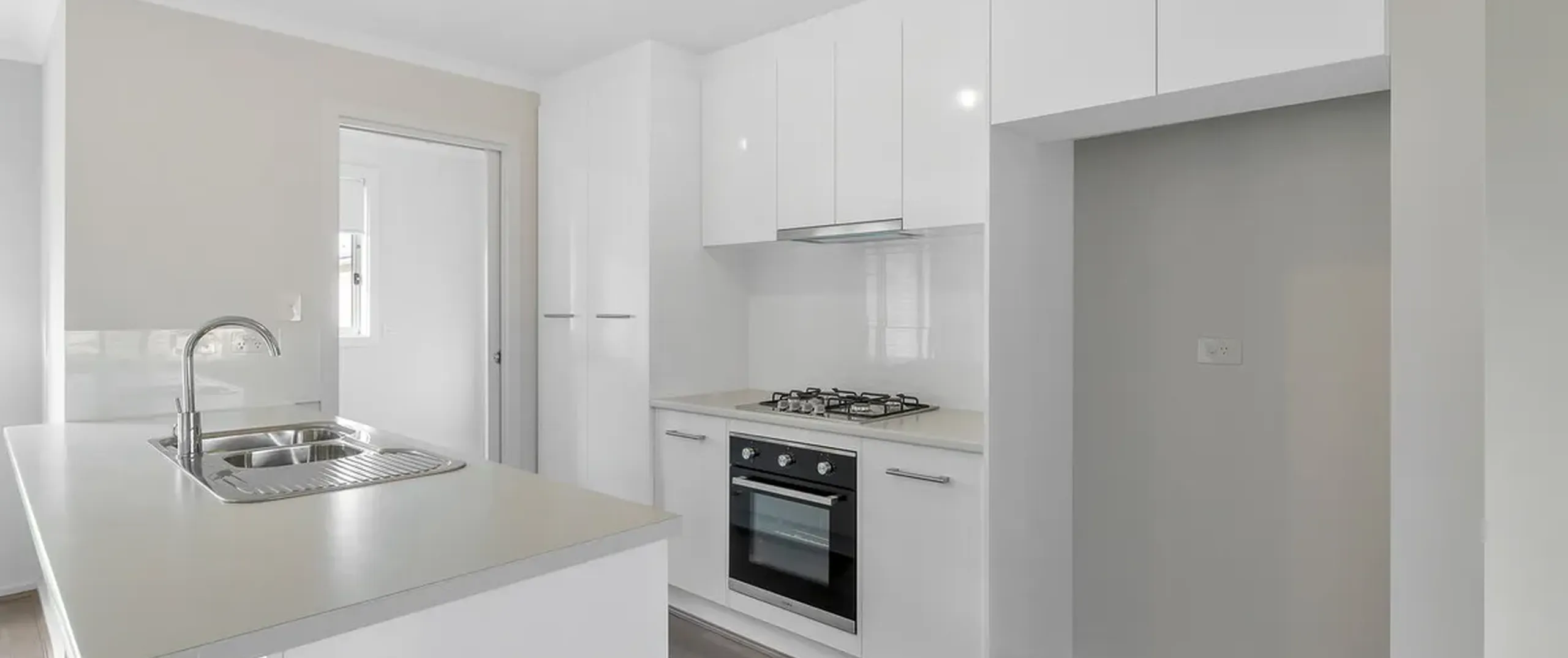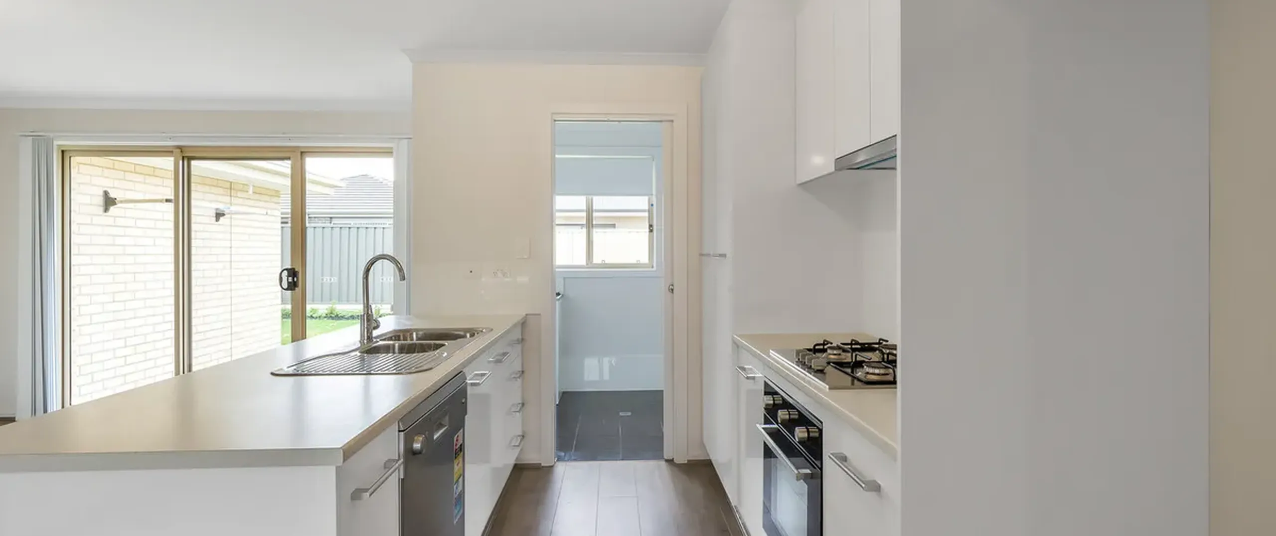 - Sparkling white kitchen with gas cooking, dishwasher, breakfast bar and ample cupboard and bench space