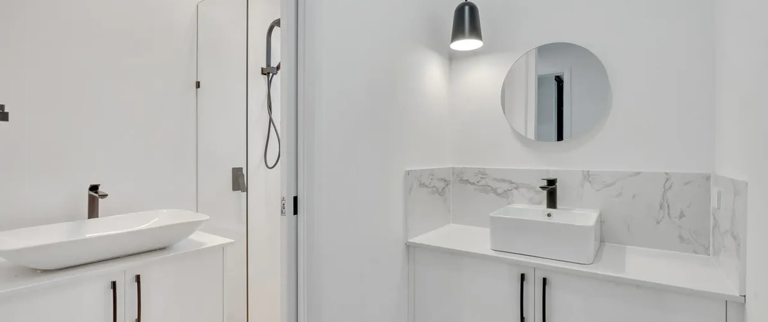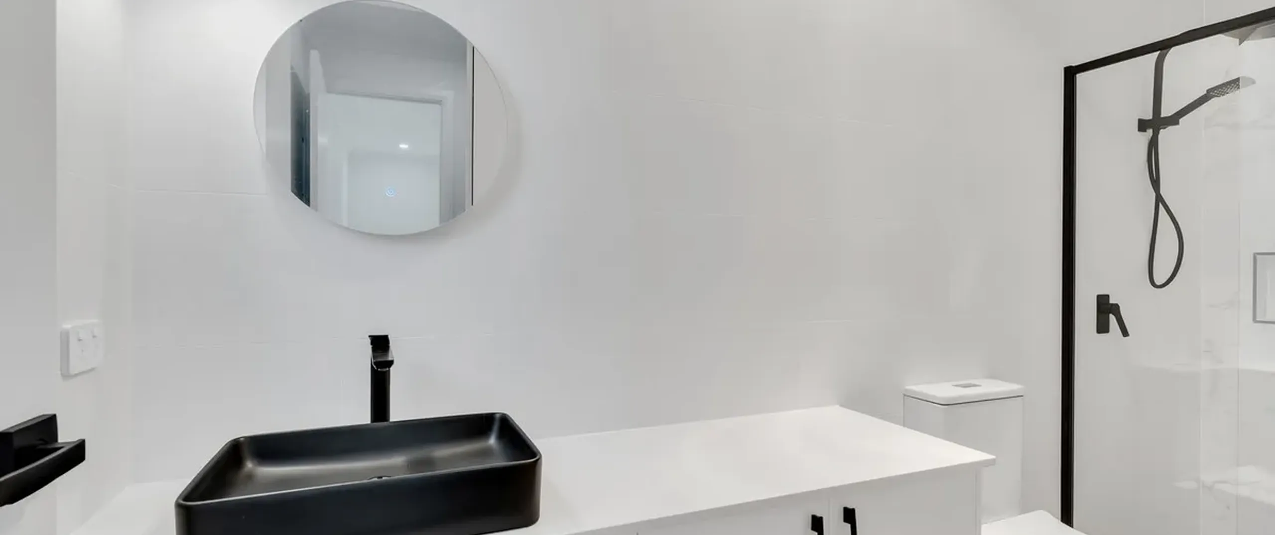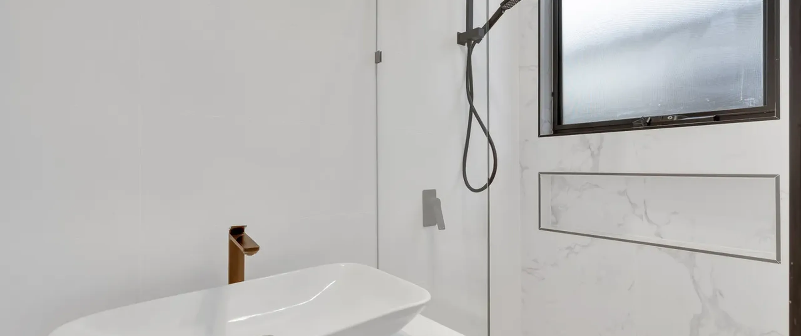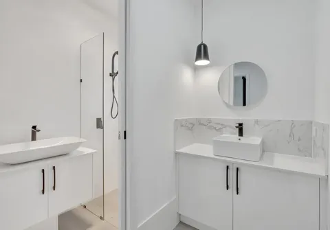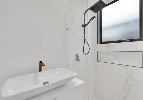 - Sparkling main bathroom with floor-to-ceiling tiles and shower