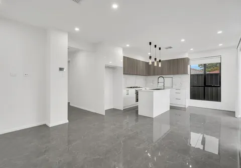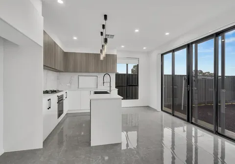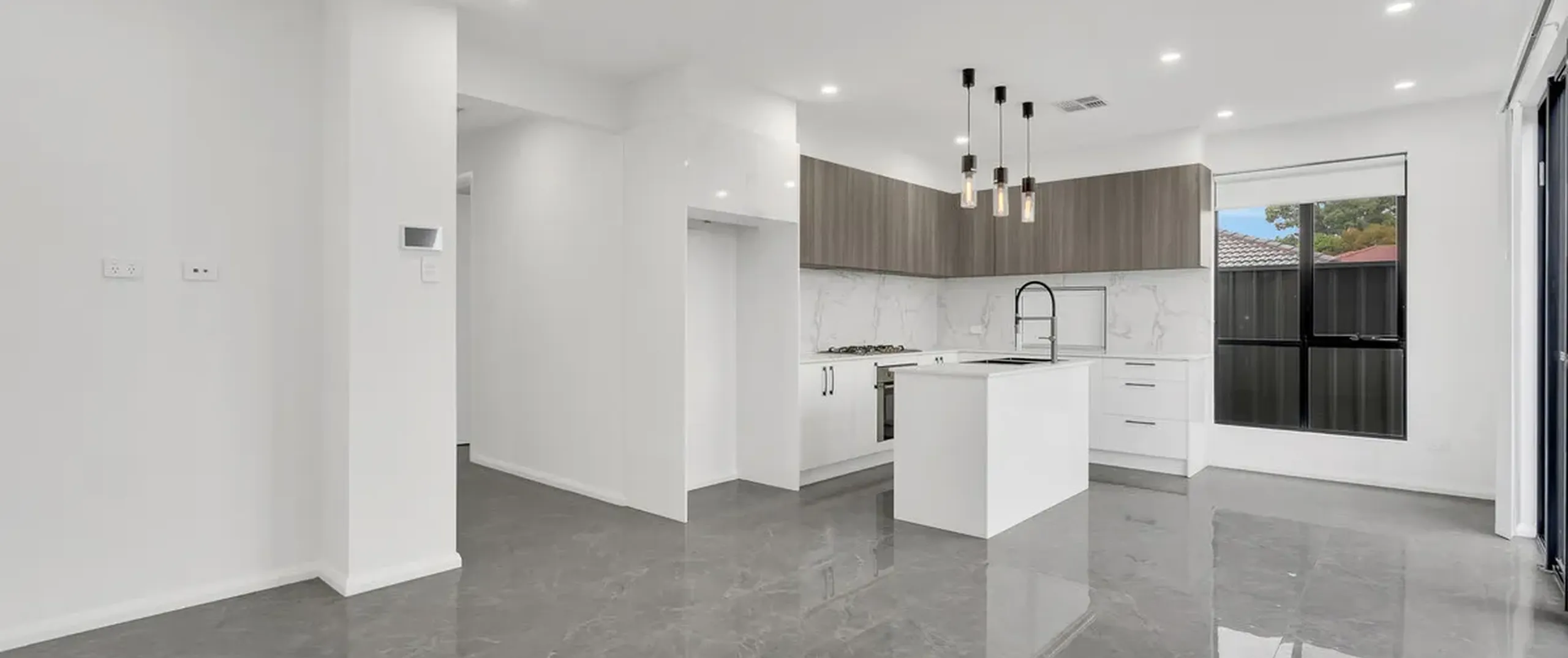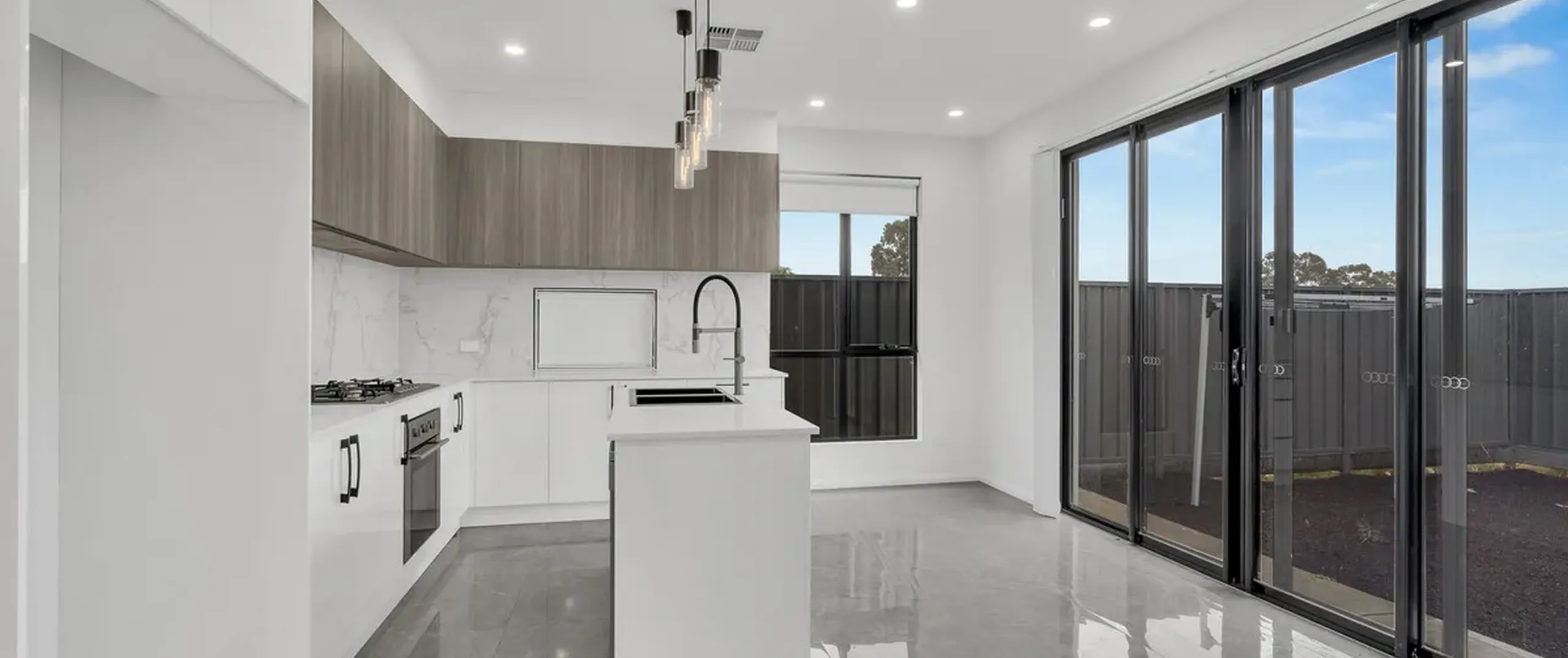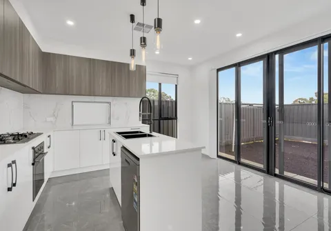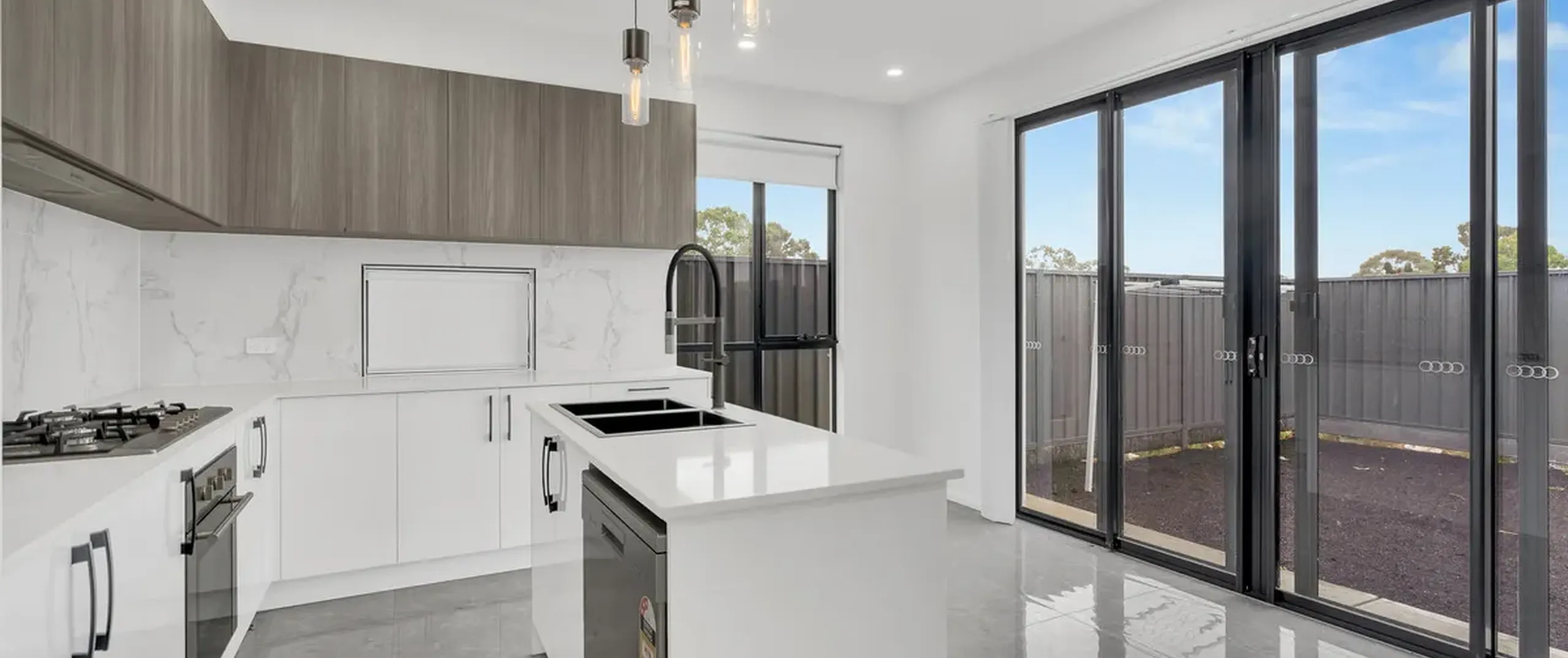 - Sleek on-trend kitchen with dishwasher, oven and gas cooktop, ample cupboard and bench space complete with breakfast bar, pendant lighting and stone bench tops