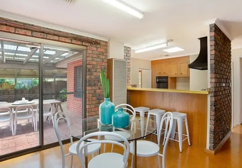 - Large lounge room with high ceilings, exposed brick, and sliding doors to the backyard
