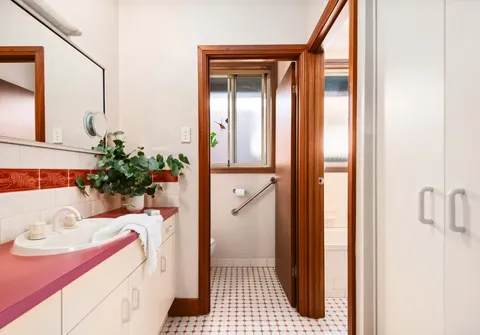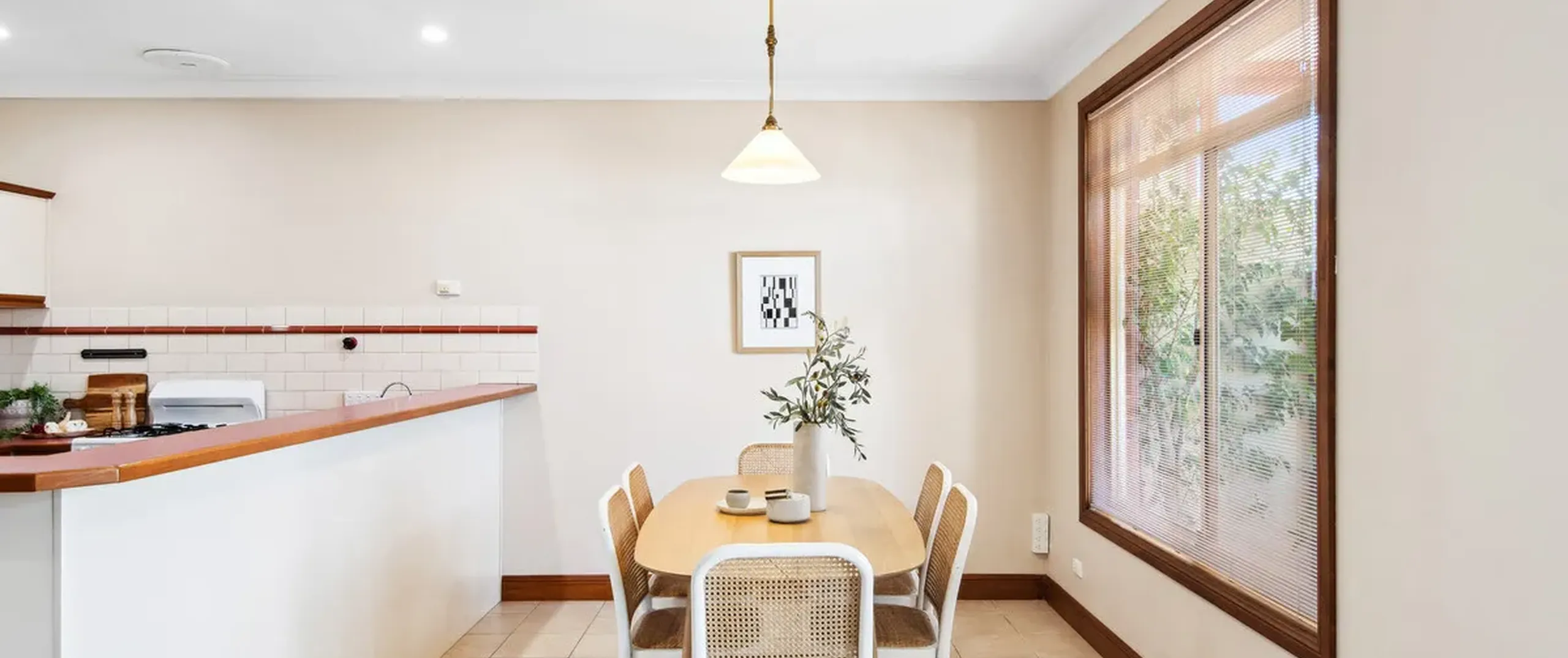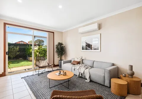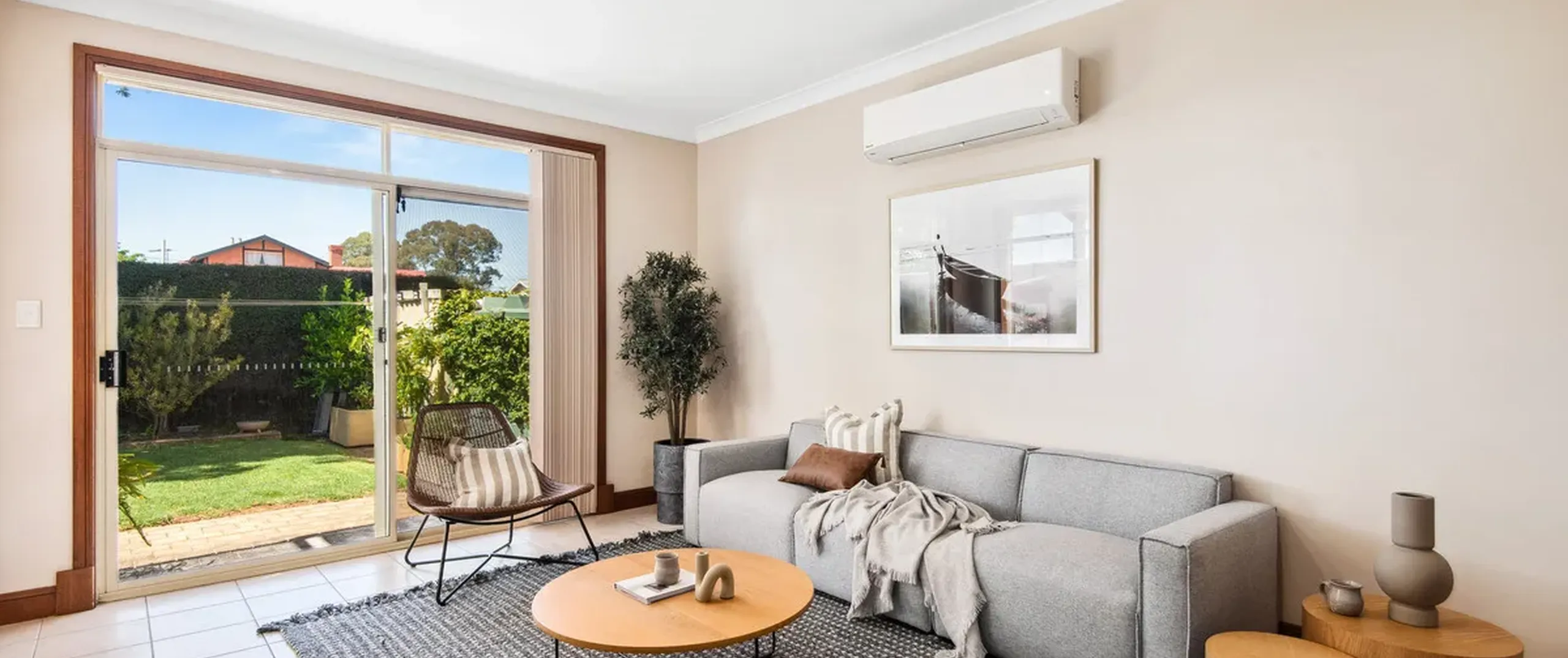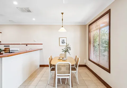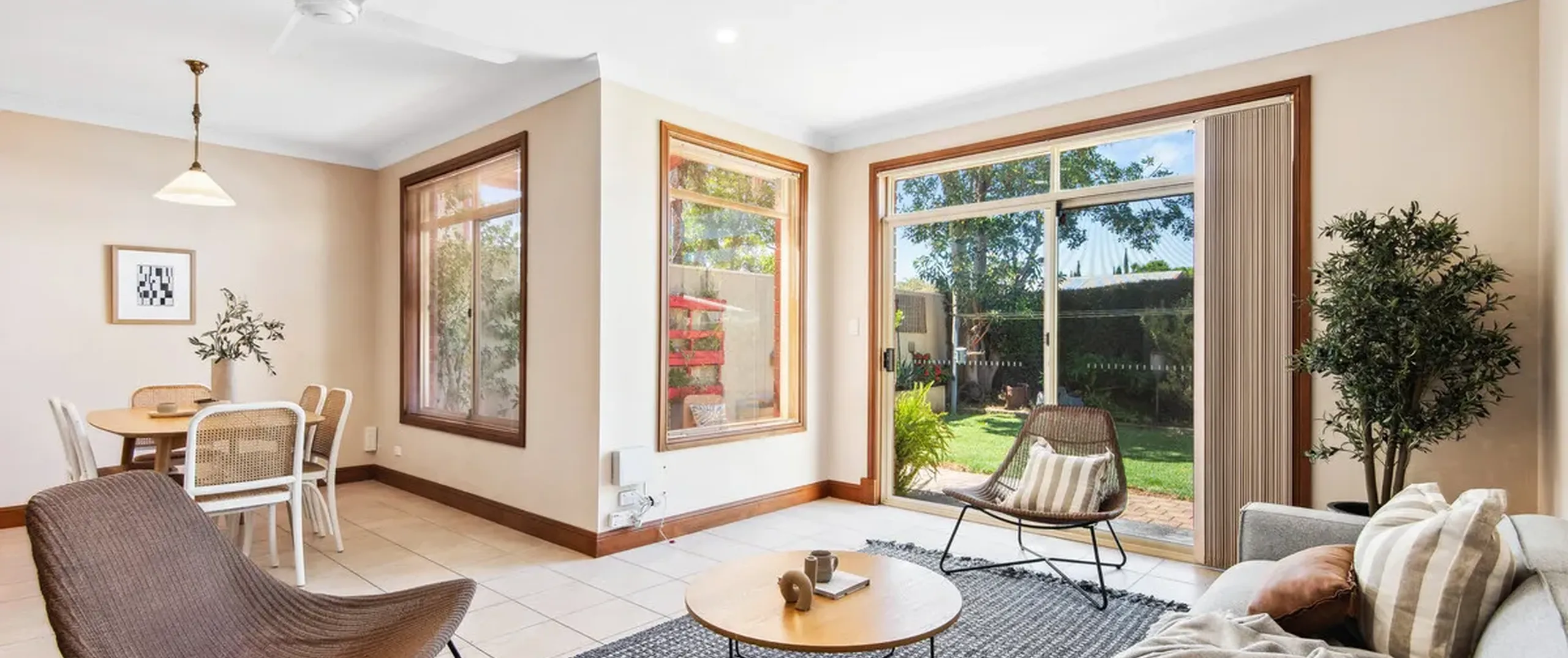 - Light filled open plan family and dining with split system air conditioner and ceiling fan, plus glass sliding door opening to the outdoor area