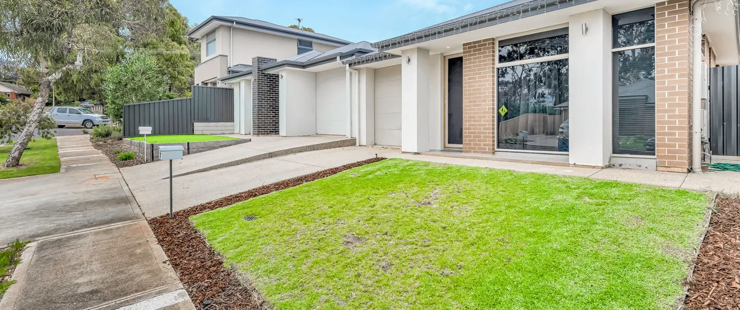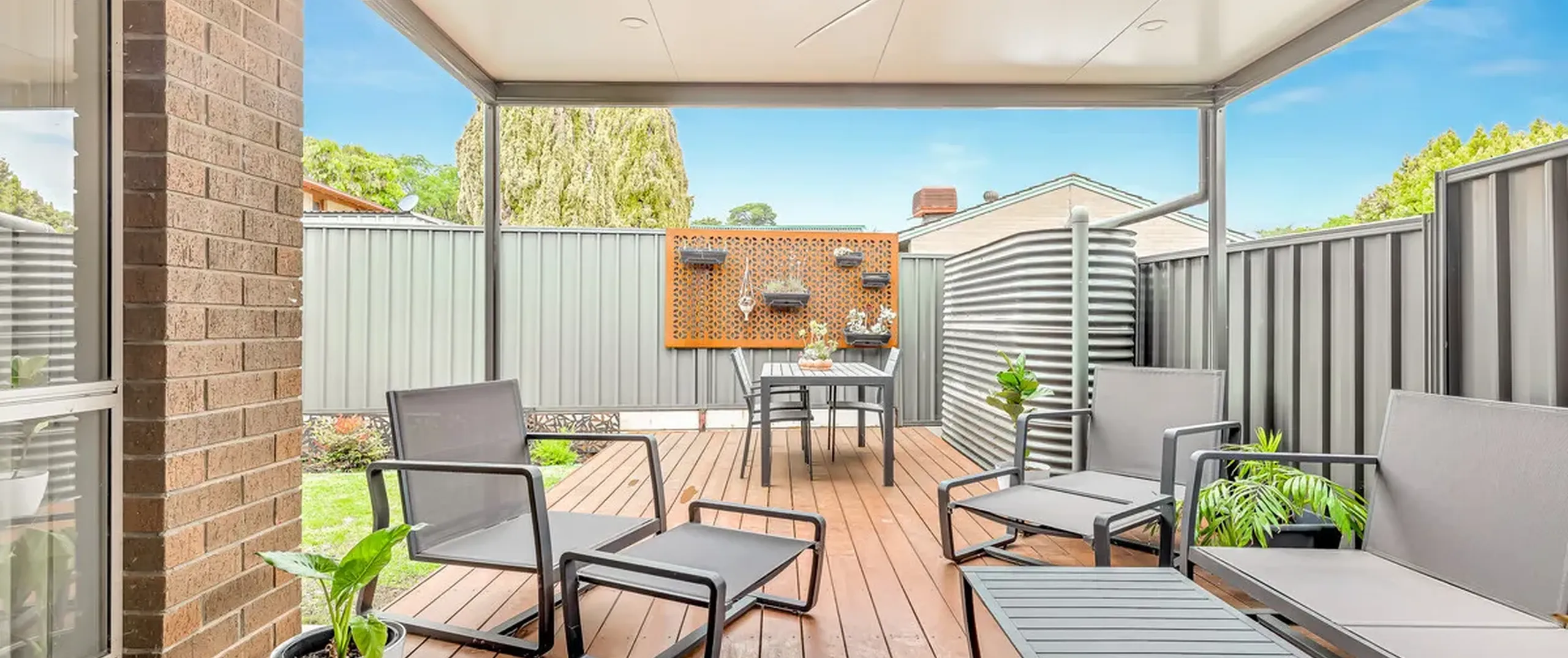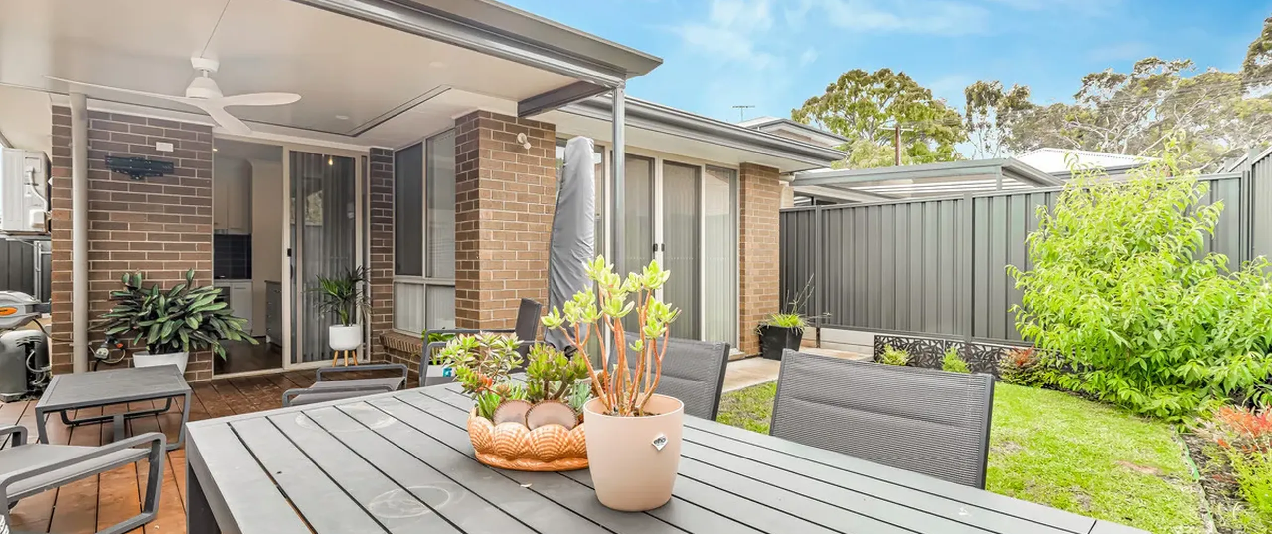 - Low-maintenance backyard with good-sized lawns with an undercover patio with ceiling fan