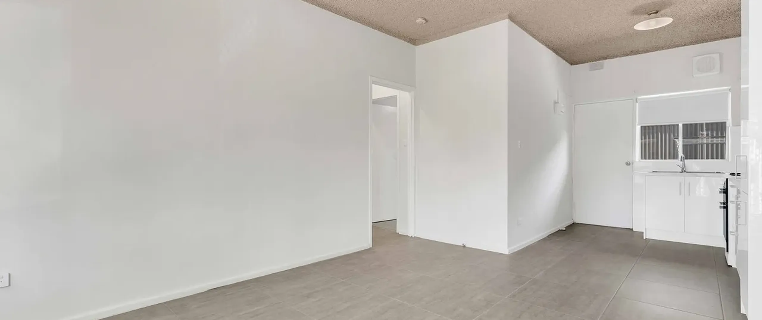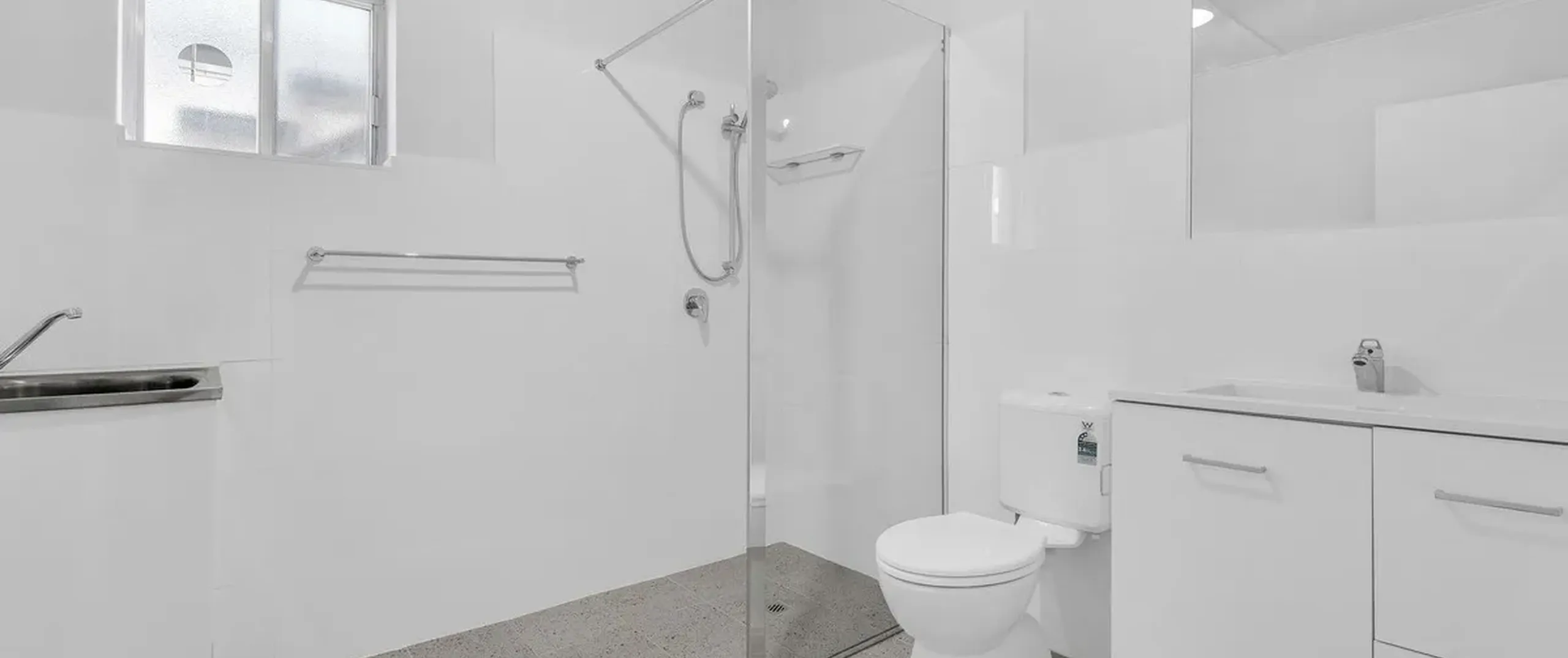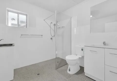 - Newly renovated combined bathroom and laundry with shower and vanity for additional storage space.