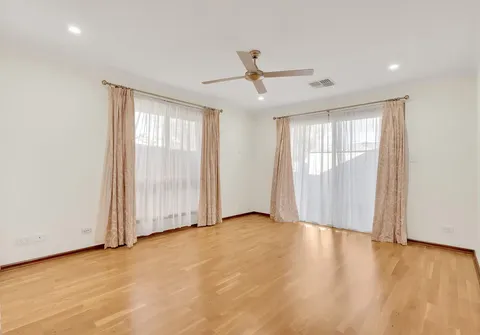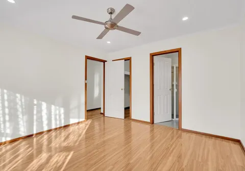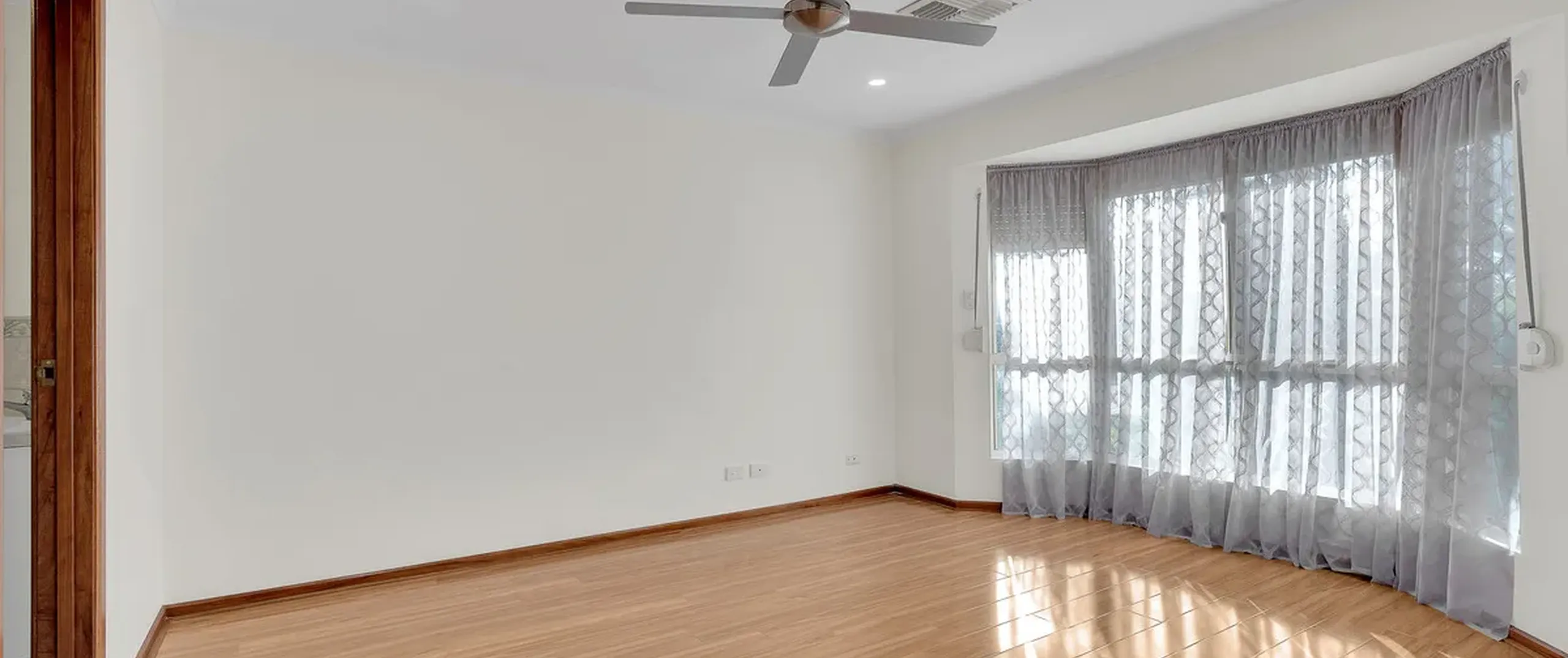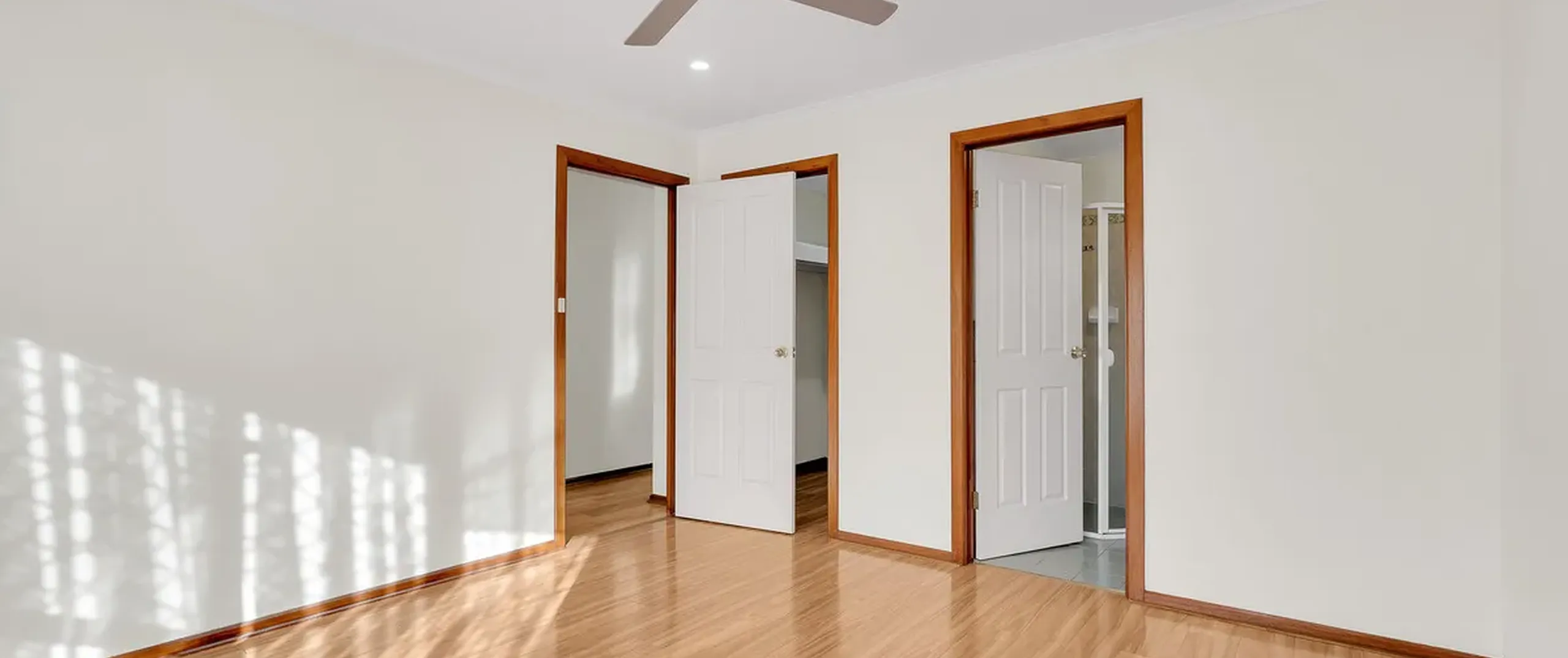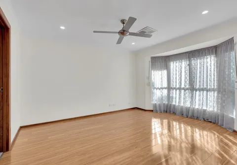- Bright master bedroom complete with floating timber floors, roller shutter, ensuite, walk-in robe and ceiling fan