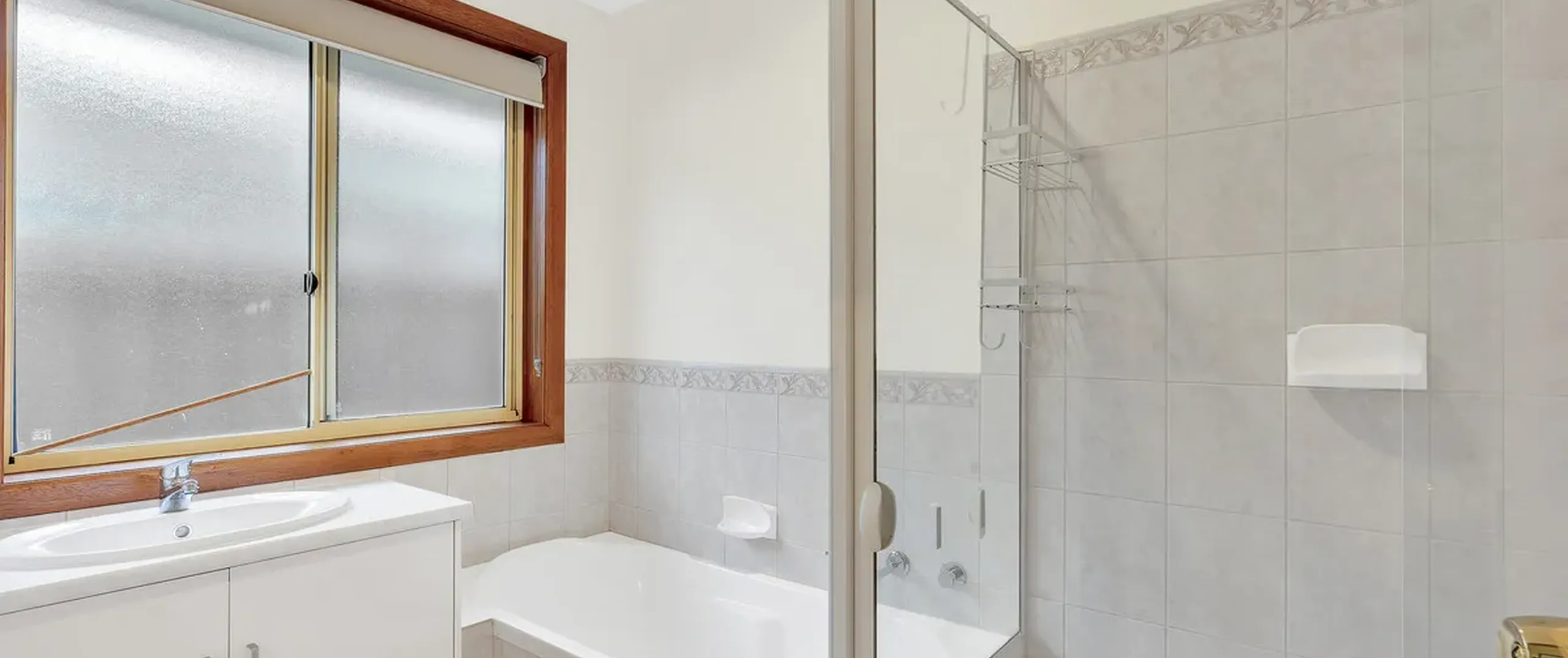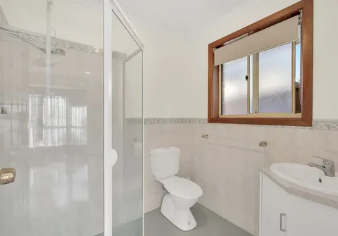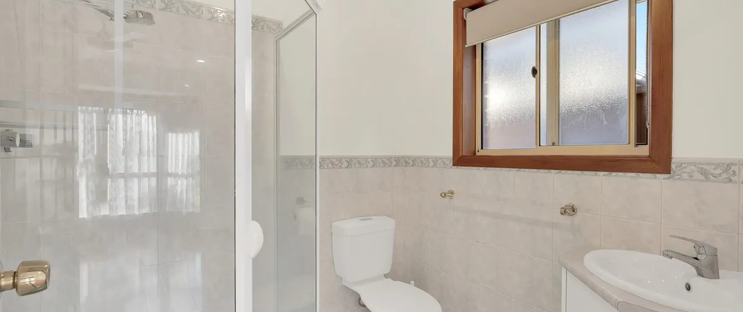 - Ensuite with corner shower, toilet and vanity with below storage space